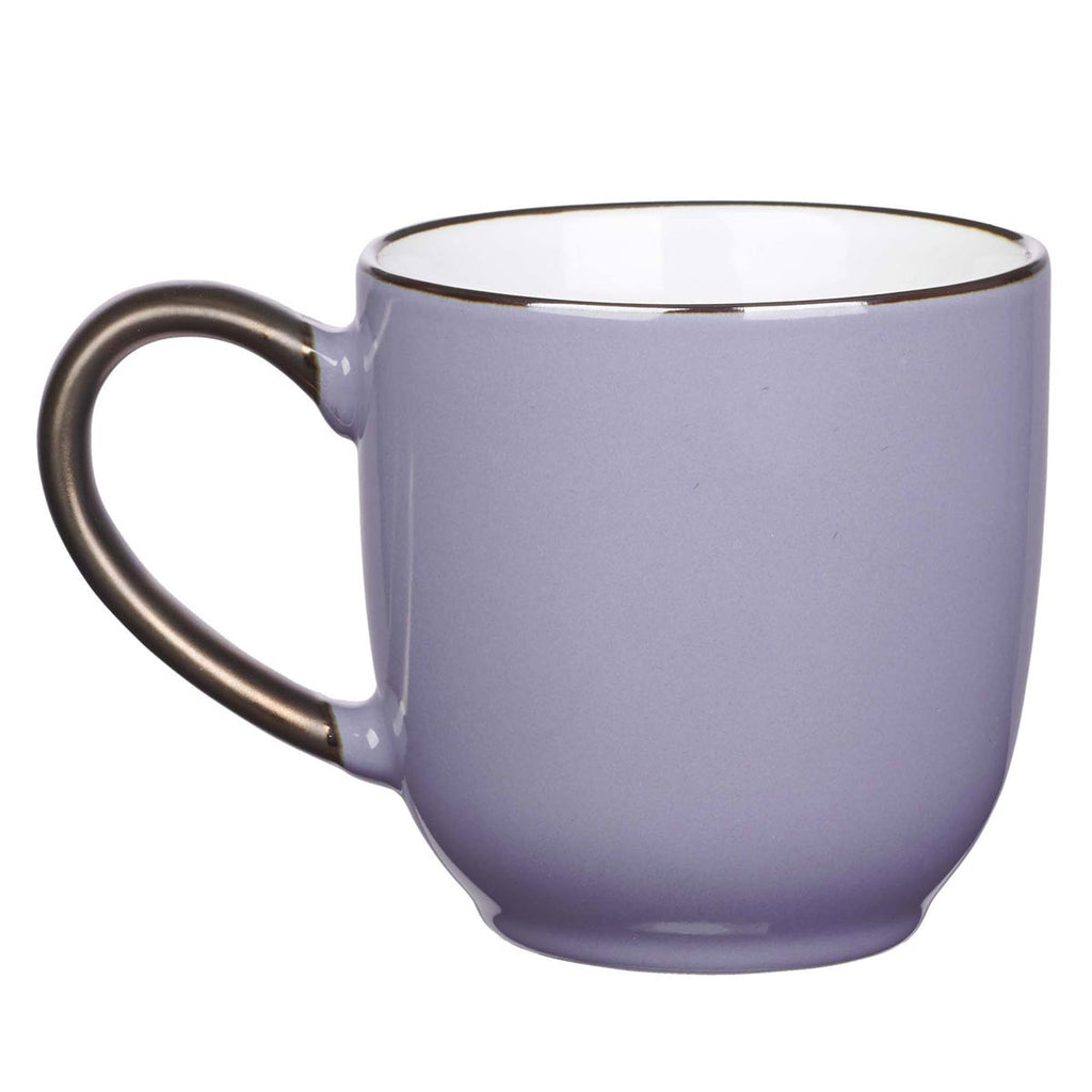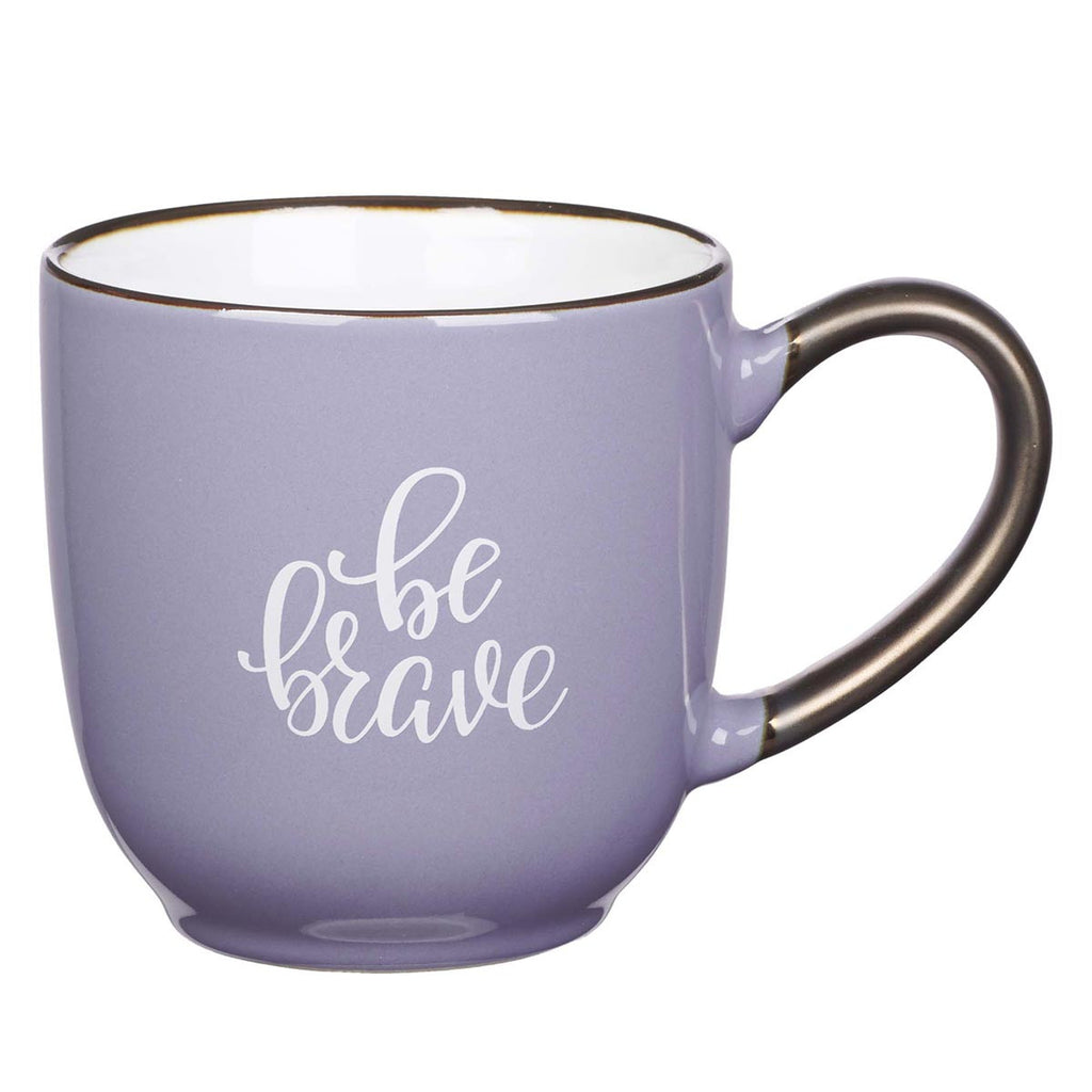 The lavender Be Brave Mug is made of ceramic. The title, "Be Brave," is scripted in white to coordinate with the white interior. The mouth and handle are rimmed in bronze. Pair the mug with a coordinating keyring and journal to act as constant reminders that you can do this.