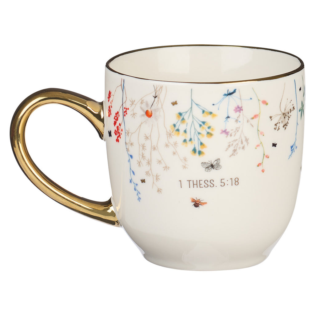 The Give Thanks Topsy-Turvy Wildflowers Ceramic Mug will enhance any cup of coffee or tea through its sheer beauty and inspiring message.