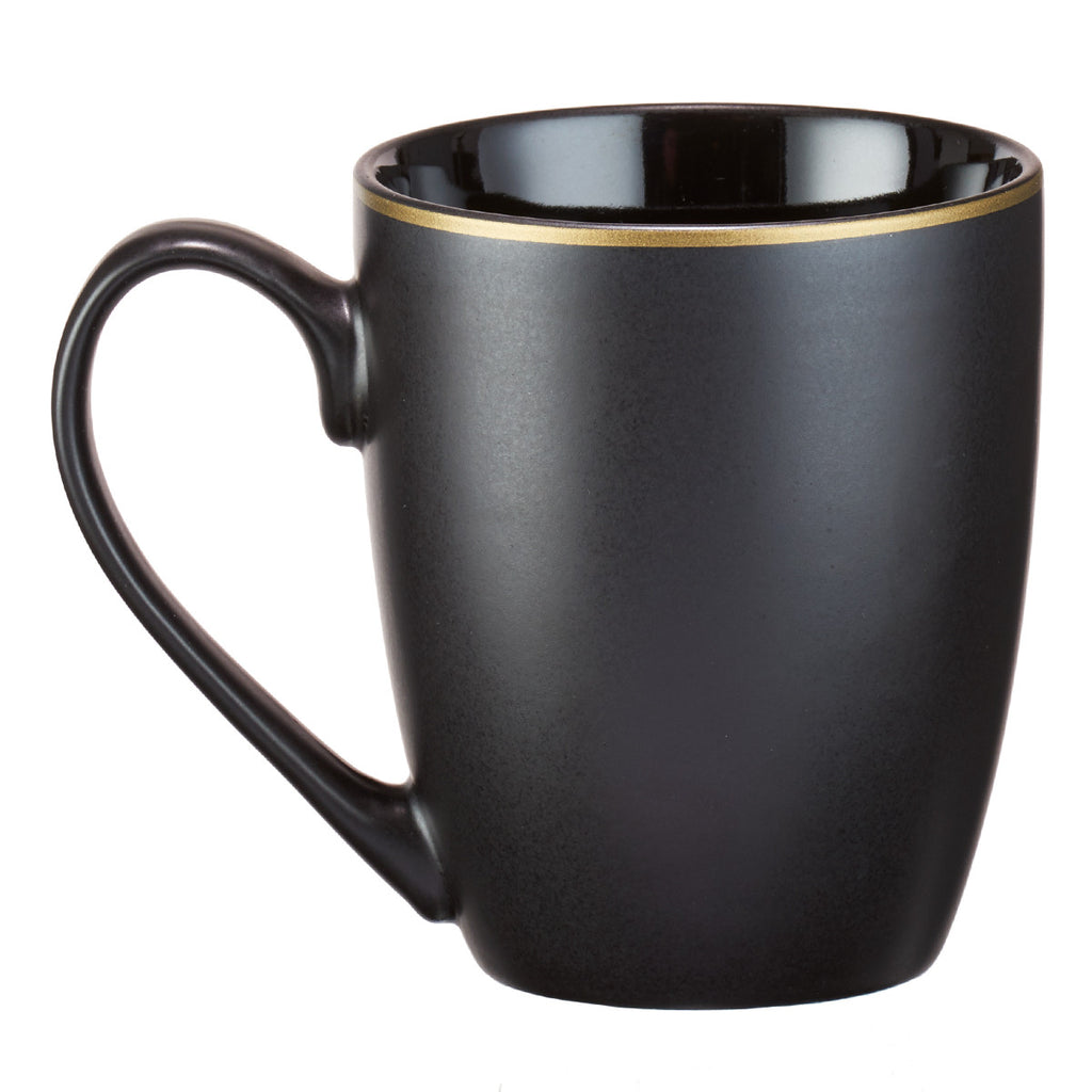 In a stylishly balanced coupe shape, this classic coffee mug is made of sturdy stoneware. Boasting an exterior matte finish in black, an elegantly scripted “John 3:16 Whoever believes in Him shall not perish” quote in white and metallic gold takes center stage on the front within an intricately scrolled design. Featuring a glossy black interior, this dinnerware mug is finished with a metallic gold trimmed rim and has the capacity of 12 ounces.Capacity: 12 fl oz