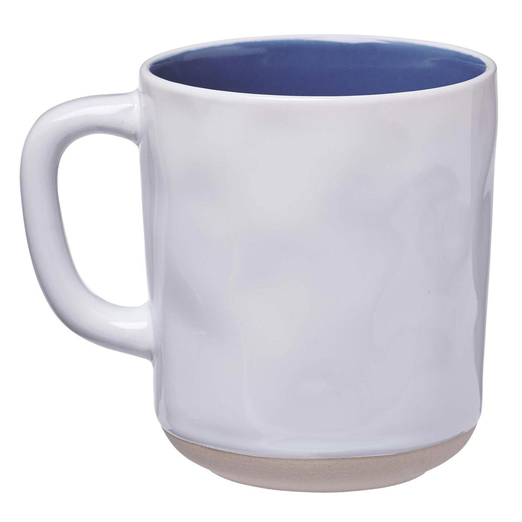 The message and interior of this white textured ceramic mug is a calming shade of blue.