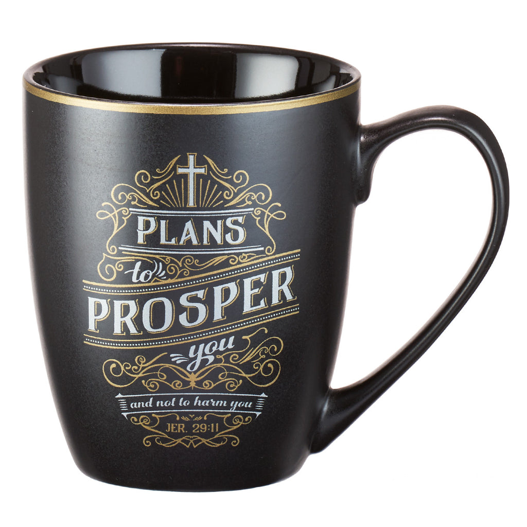 Boasting an exterior matte finish in black, an elegantly scripted “Plans to prosper you and not to harm you Jer. 29:11” quote in white and metallic gold takes center stage on the front within an intricately scrolled design. Featuring a glossy black interior, this dinnerware mug is finished with a metallic gold trimmed rim and has the capacity of 12 ounces. This Christian mug makes a thoughtful gift for a job seeker, recent graduate or a wonderful gift of encouragement for loved ones as it comes with a coordinating gift box.