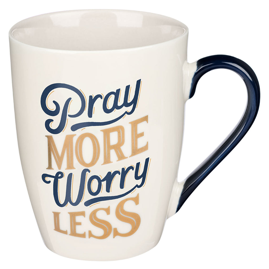 Let the Pray More Worry Less Navy and Gold Ceramic Coffee Mug remind you to bring your problems to God instead of letting them consume you. With this ceramic coffee mug at your side, you will be reminded to spend time talking to God rather than complaining to friends.