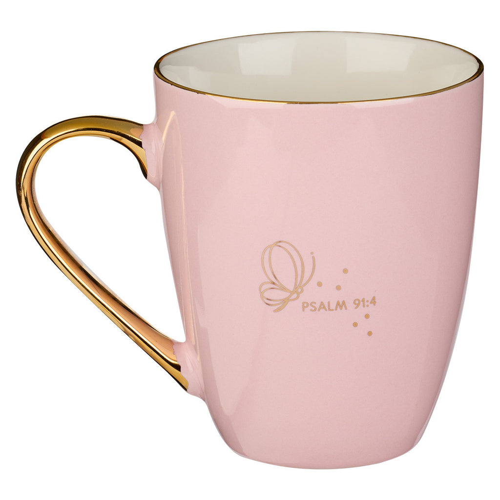A thin gold foiled band rims the cup and matches the gold foiled handle. On the back of the cup, right at the bottom, the Scripture reference appears in small gold foiled letters accented by six starry gold foiled dots.