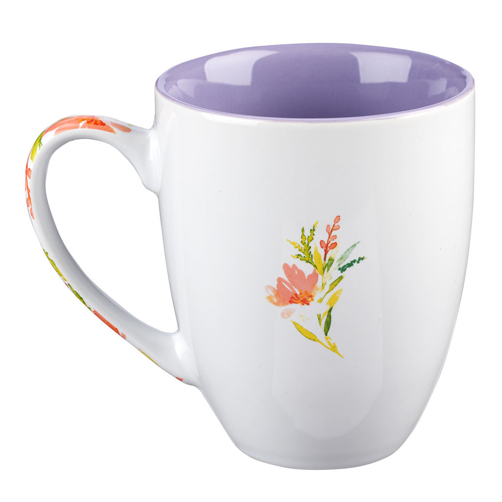 The inside of the mug is colored a glossy pastel purple, while a row of watercolor flowers runs down the handle.