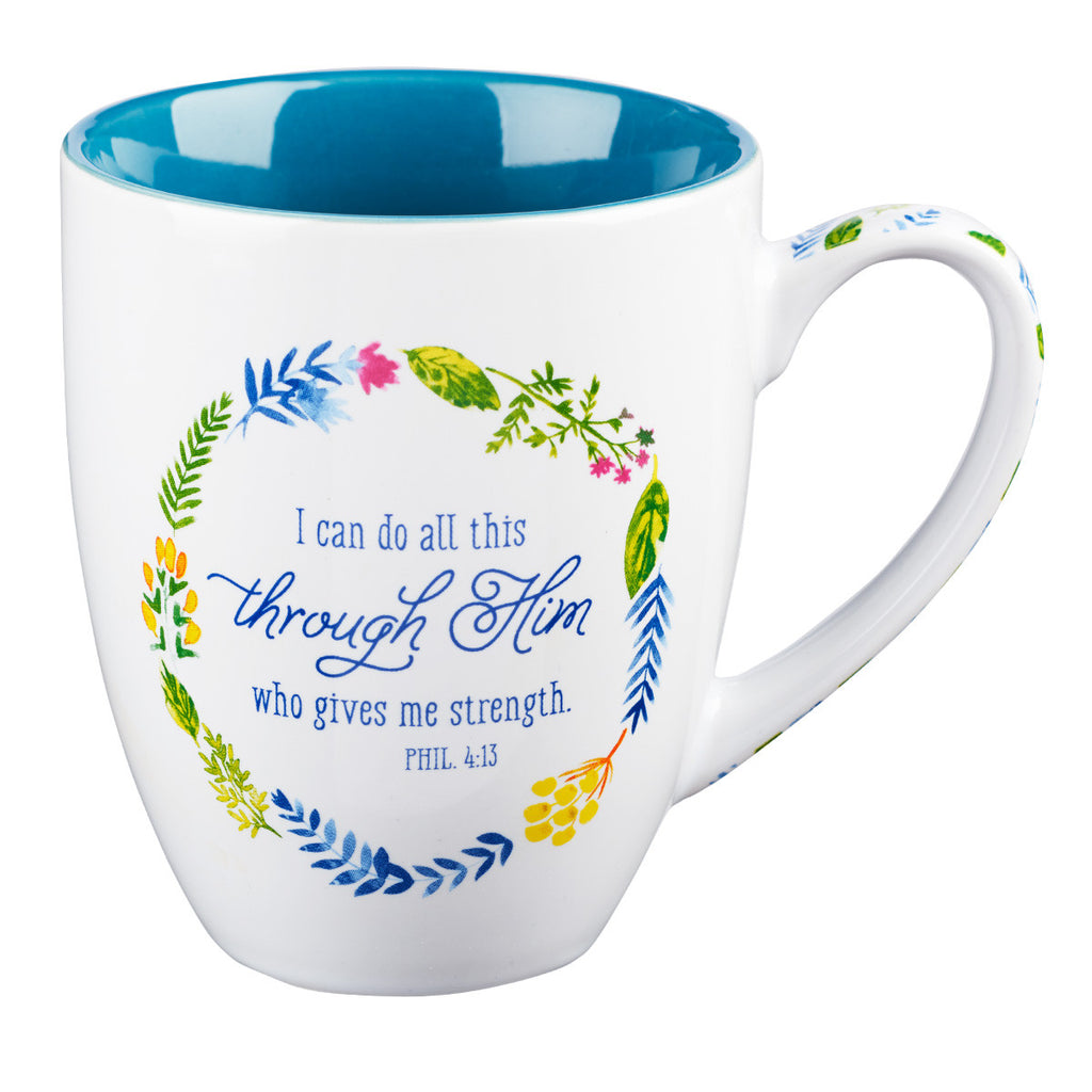 The I Can Do All This Through Him Ceramic Coffee Mug will become your go-to-mug in times of struggle because of the promise it proclaims: Christ gives you the power to be content in all circumstances.