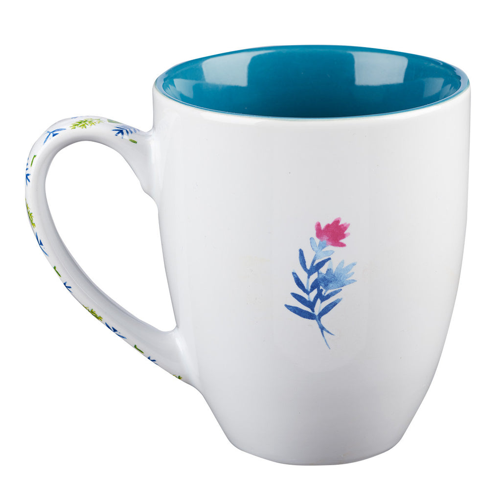 The back of the mug shows a simple floral bouquet while a spray of flowers runs down the handle. The inside is colored in a bright glossy blue that contrasts beautifully with the white.