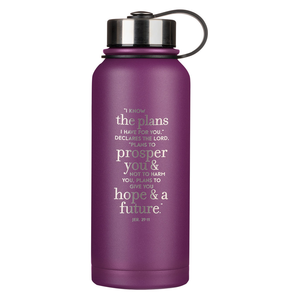 The generously sized I Know The Plans Lilac Purple Stainless Steel Water Bottle will keep your body hydrated and your mind awash with the promises of Scripture. Armed with this bottle filled with icy water and God's sustaining promise, you will get through any day!
