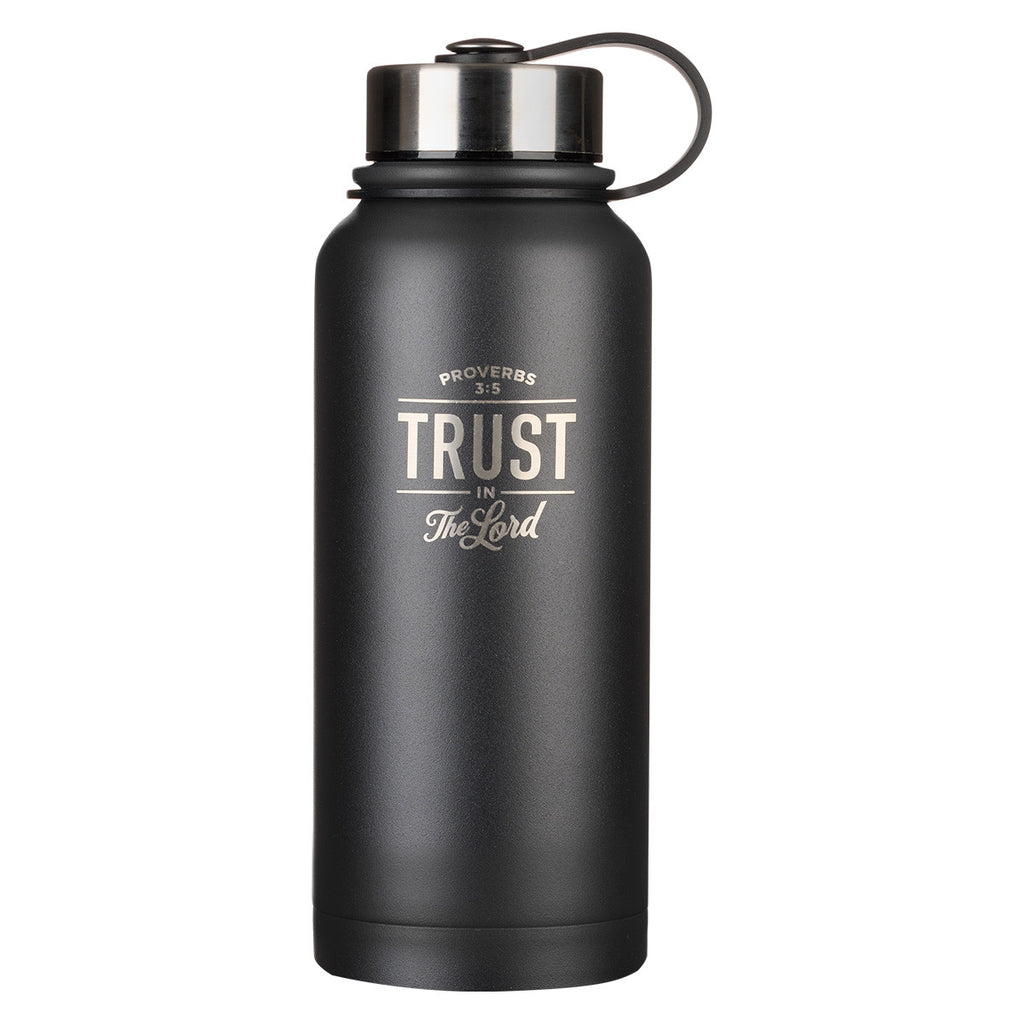The liberally sized Trust in the LORD Black Stainless Steel Water Bottle will equip you to meet your hydration goals as you meet the tasks of your day. Each time you glance at the Scripture engraved on the water bottle, you will e reminded that you follow a God you can trust.
