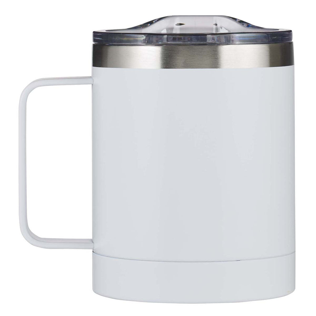 are laser engraved, exposing the stainless steel layer beneath. The double-wall insulation and stainless steel interior ensure that warm drinks stay warm and cold drinks stay cold for hours! The matte white finish feels comfortable to the touch. An exposed band of stainless steel around the top of the camp style mug gives balance to the design. A snugly fitting transparent lid with a retractable sip-hole closure keeps beverages from leaking, splashing, or spilling, and a D-shaped handle makes for easy lifting.