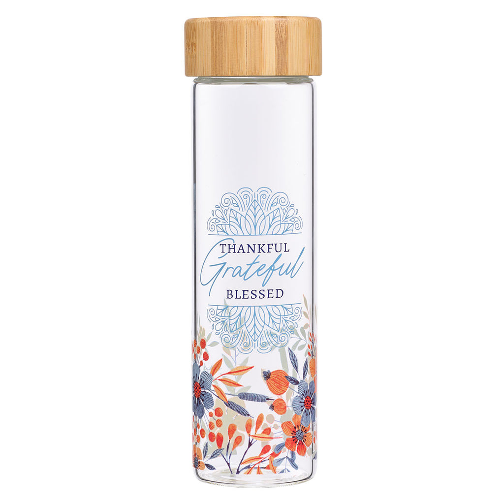 TheThankful, Grateful, Blessed Glass Water Bottle with Sleeve, with its vibrant fall colors, makes a beautiful hostess gift during the thanksgiving season.