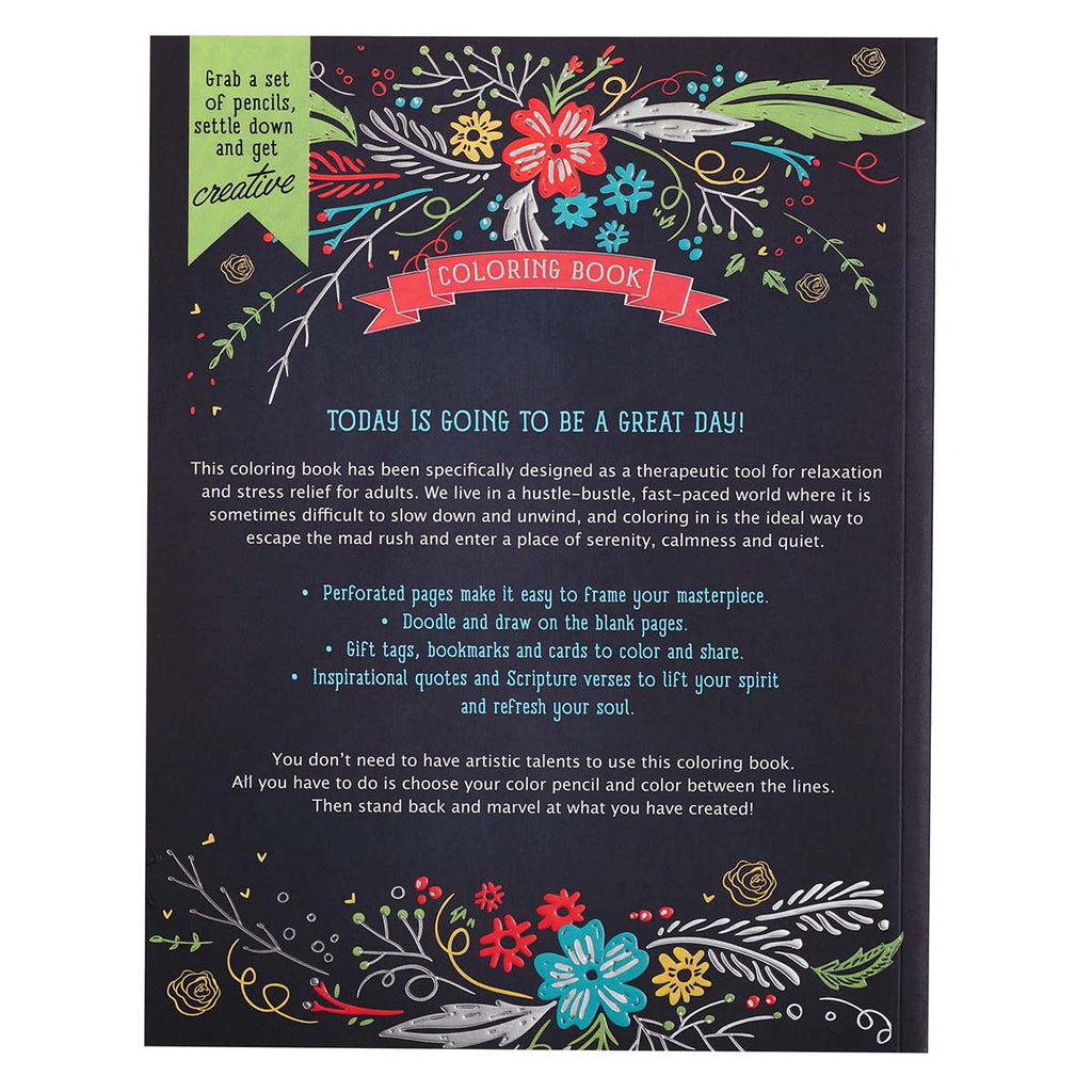 The cover of the Today is Going to be a Great Day Coloring Book is black, and the lettering is foiled in silver. The design reminds one of an old fashioned chalkboard. The book is bound in heavy-duty stock and features 128 perforated pages with 62 images to color.