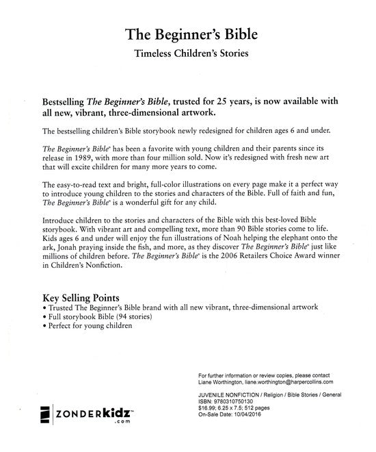 The best-selling Bible storybook of our time, with over25 million products sold! Introduce children to the stories of the Bible through vibrant art and compelling text with The Beginner?s Bible--- full of life and fun, and featuring brand new vibrant, three-dimensional art.The Beginner's Bible is the 2006 Retailers Choice Award winner in Children's Nonfiction.
