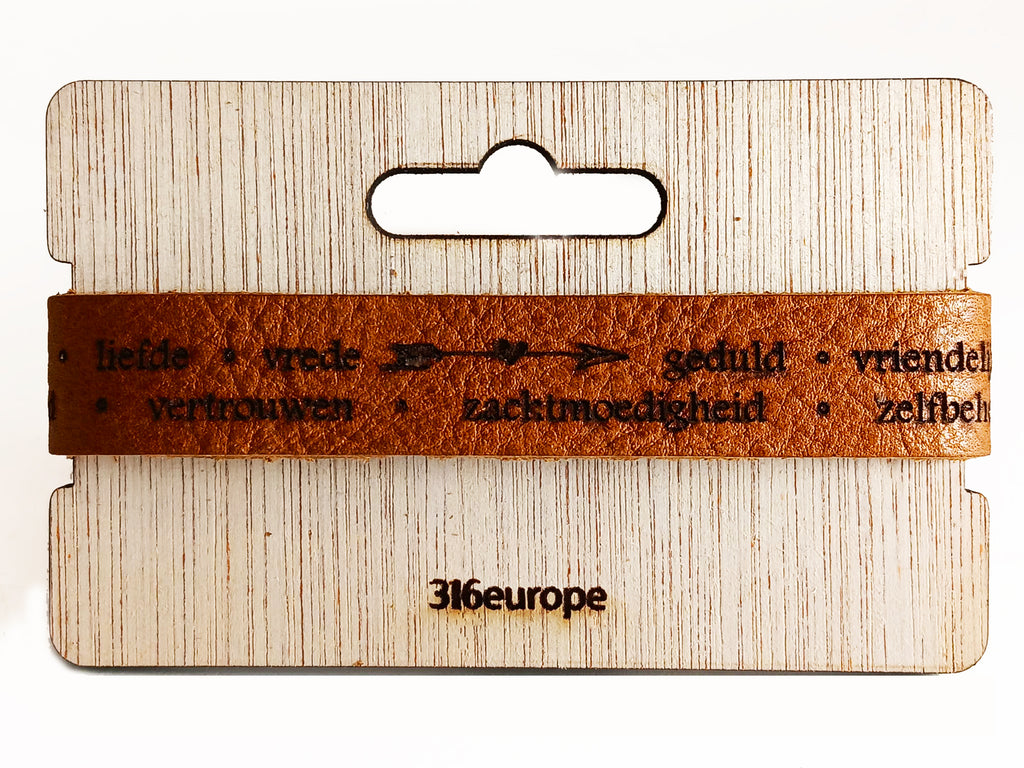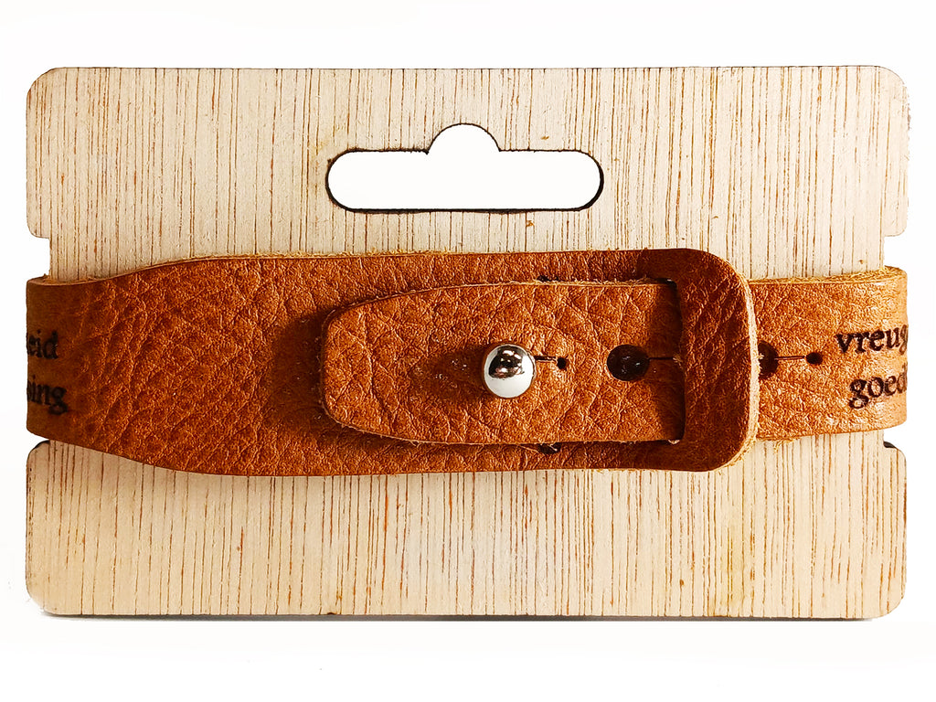 Bruin leren armband met de vruchten van de Geest op de arband. Deze armband is niet alleen een stijlvol accessoire, maar ook een bevestiging het werk dat de Geest in ons leven doet. Met zijn verstelbare ontwerp in drie maten past hij comfortabel. In een eenvoudige, toch elegante design.