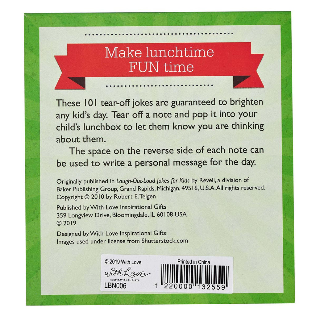 Why did the chicken cross the road? Find out when you pop one of the jokes from 101 Lunchbox Notes with Laugh-out-Loud Jokes for Kids into your child's lunchbox. Each of the colorful tear-off lunchbox notes has a blank space on the back to write a message. Send your kids words of love and encouragement along with a joke that will brighten their day and is sure to make them giggle in delight. Share a laugh with your little ones even when you can't be with them.