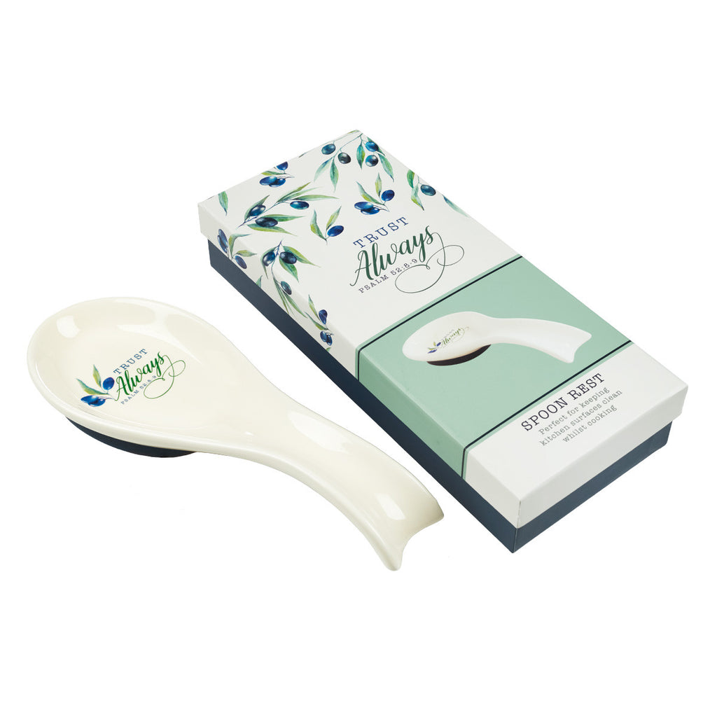 Whether you’re preparing a celebration brunch for your Bible study group or dinner at home with your family, the Trust Always Spoon Rest makes a great addition to your kitchen while you’re cooking away. Each time you place a large spoon or spatula on the Christian spoon rest, you’ll read the message on the base of the Olive Branch Spoon Rest, “Trust Always” from Psalms 52:8–9. These words will firmly remind you that the Lord is in everything and calls you and your loved ones to trust Him always—in all circumstances.