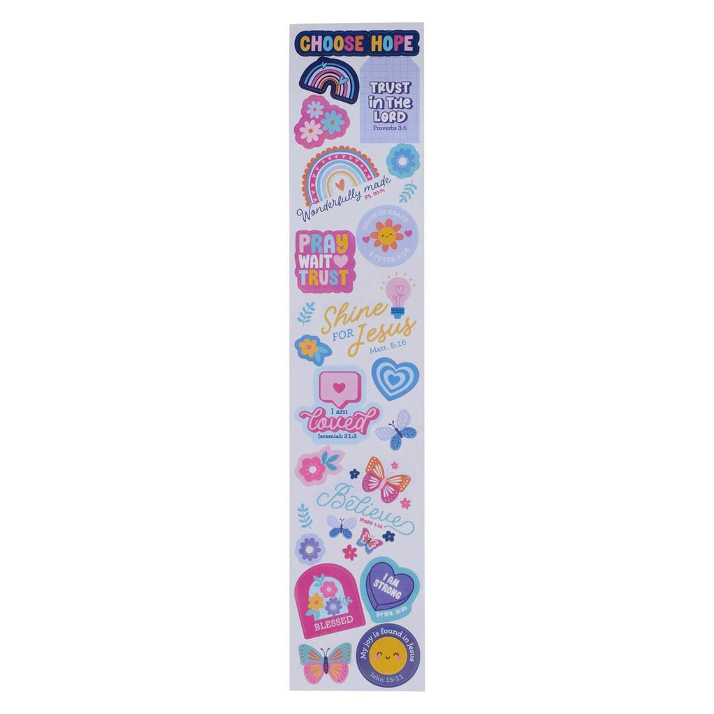 Let your daughter decorate her life and adhere these stickers anywhere that stickers go, whether it's a journal, homework book, bedroom wall, or bedside cabinet! Bold purples and teals, sunny yellow happy smiley faces, flowers and butterflies in bright pastels paired with meaningful Scripture will add a little faith-filled creativity to her day.