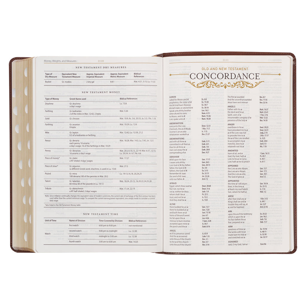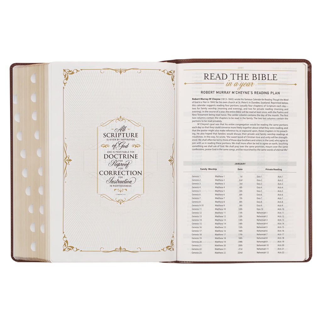 Immerse yourself in a new way of studying the classic King James Version text with the polished Art Nouveau Framed Toffee Brown Faux Leather Large Print King James Study Bible with Thumb Index. This updated large print study Bible places a strong emphasis on personal and family devotions, creating a meaningful and enriching study experience.