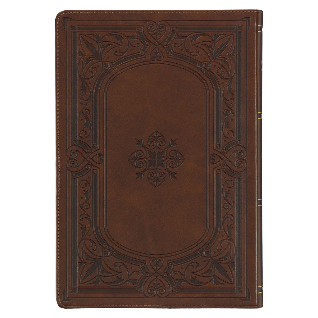 The front cover of this toffee brown faux leather Study Bible features a beautifully heat-debossed ivy art nouveau design that elegantly frames the title. The gold-foiled title and version reference add a touch of sophistication to the front cover.