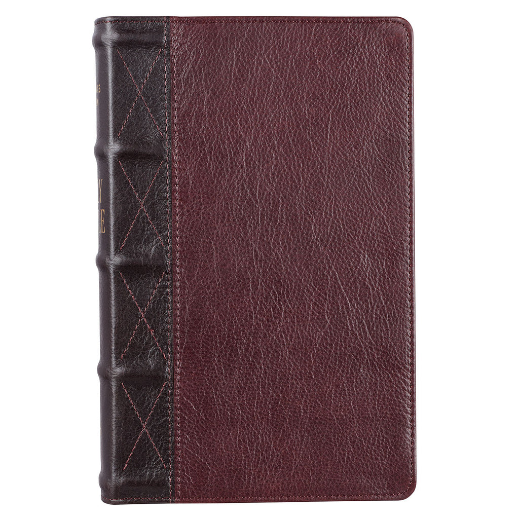 The Two-tone Brown Full Grain Leather Giant Print King James Version Bible with Thumb Indexing is perfect for any man or woman who has sophisticated taste and prefers a Bible that reduces eye strain. The classic design of this KJV Bible complements every style, and the giant print is easy on the eyes.