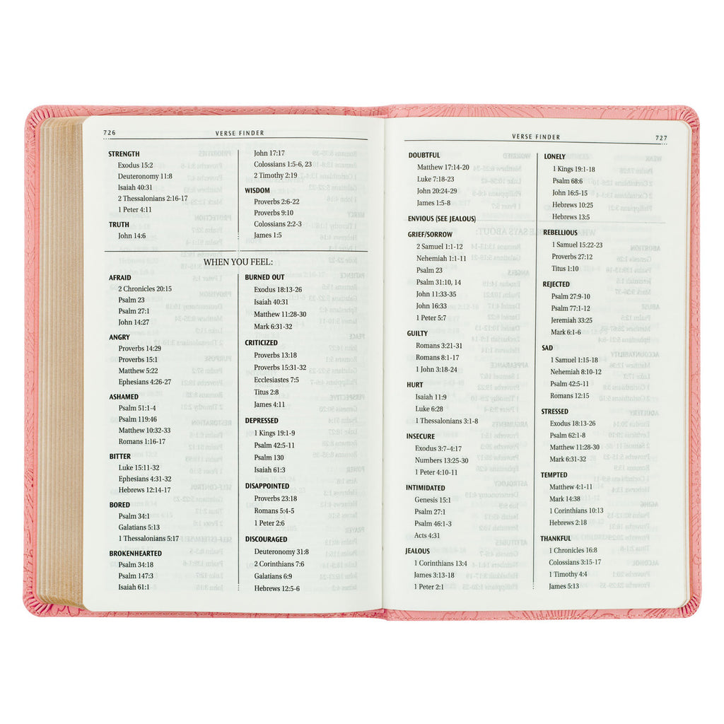 The Bible features a lay-flat spine, ensuring it opens completely flat, while a delightful pink presentation page that can be inscribed with names and a date adds a personal touch. With its lightweight and thin profile, this Bible is printed in a small but legible 8-point type with text that is presented in a double-column format. The Bible includes a practical thematic Scripture verse finder and a comprehensive one-year Bible reading plan for enhanced study.