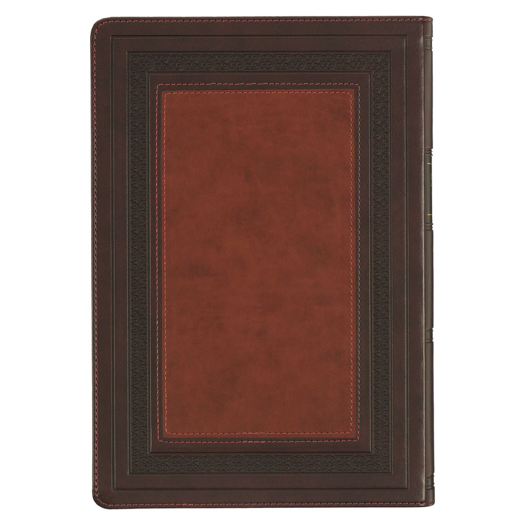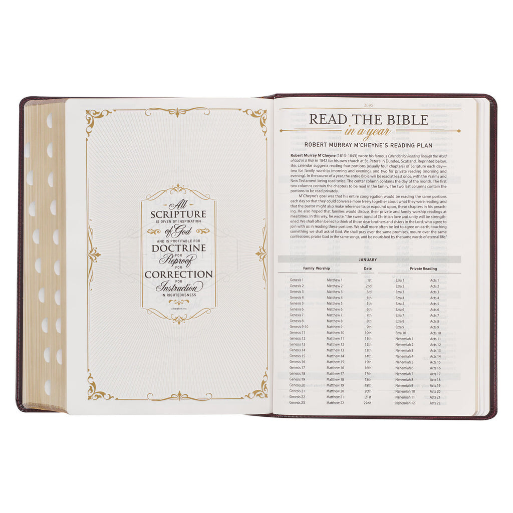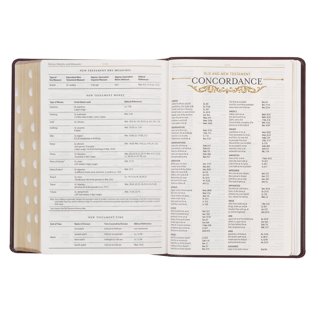 Experience the Burgundy and Saddle Tan Faux Leather Large Print King James Version Study Bible with Thumb Index, a treasure trove of invaluable study notes, essays, and insights. Its large, easy-to-read font makes it the perfect study Bible for mature Christians and those seeking to deepen their faith.