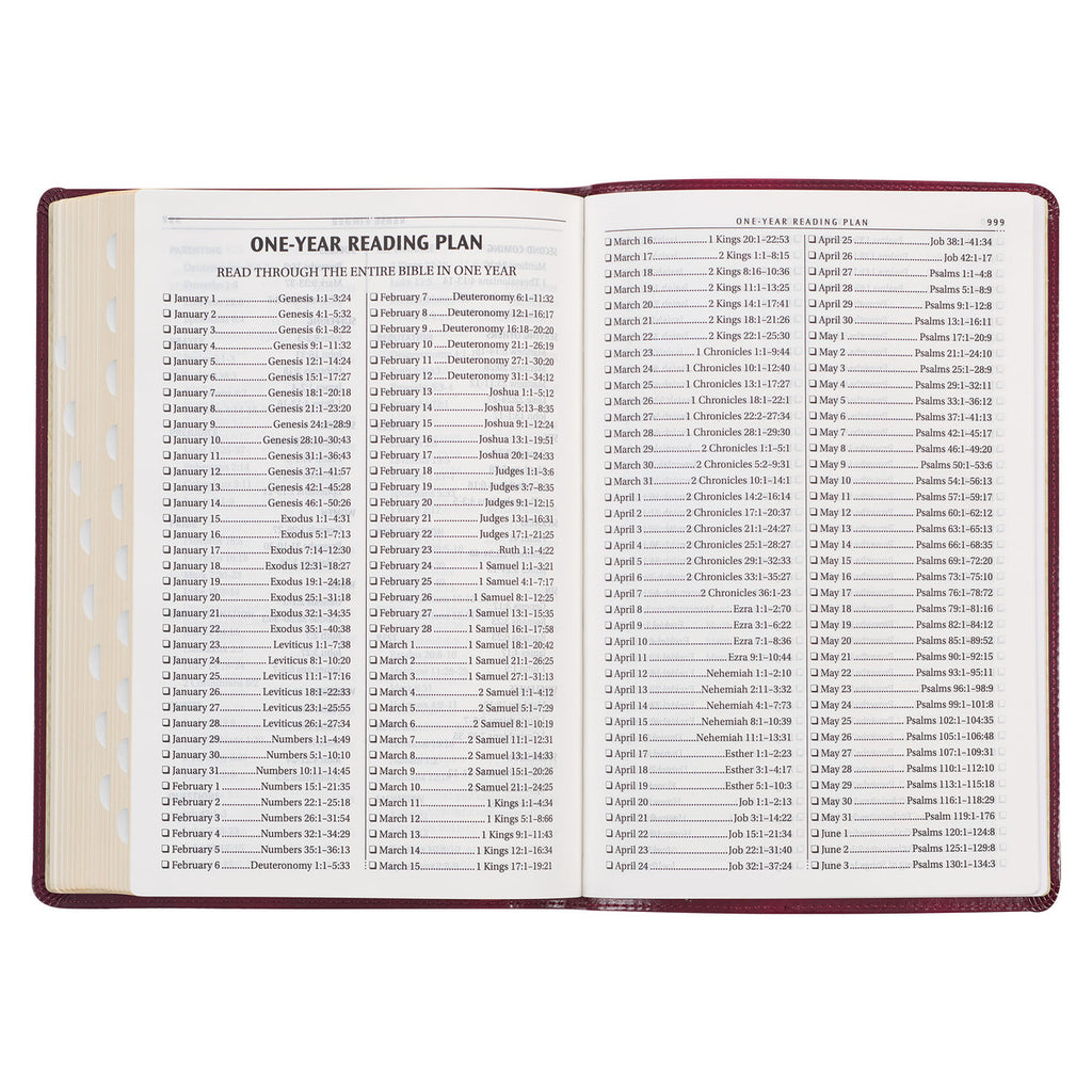 With its lay-flat binding, the Bible's flexible cover is sturdy and strong, allowing it to open effortlessly without damaging the pages or spine. A burgundy satin ribbon serves as a handy page marker, while the black thumb indexing tabs assist the reader in navigating through the Bible. The topstitching along the cover's edges ensures durability, while the gilt-edged pages add a touch of subtle elegance to this timeless design. The Bible comes packaged in a full-color printed cardstock sleeve.