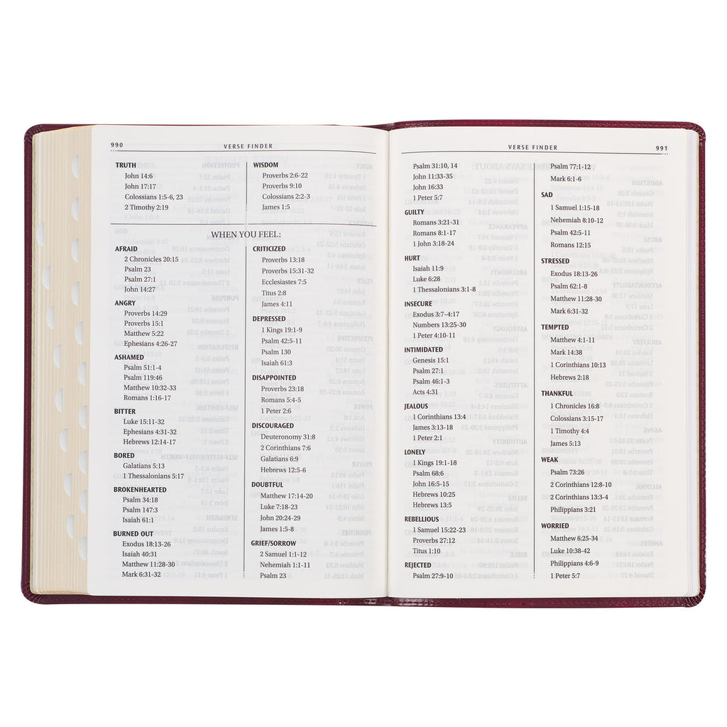 The Burgundy Cross Faux Leather Large Print Thinline King James Version Bible with Thumb Index presents the Classic King James Version text in a lightweight modern thinline binding that rests perfectly in your hand.