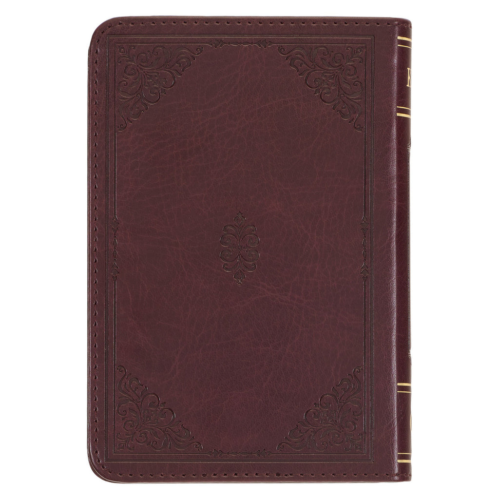 The burgundy faux leather covers of the pocket Bible are adorned with two frames: a simple heat-debossed outer frame that is matched by an inner heat-debossed frame with intricate corner scroll patterns and line designs. The title is presented in large, gold-foiled letters, with the version reference in gold foil below.