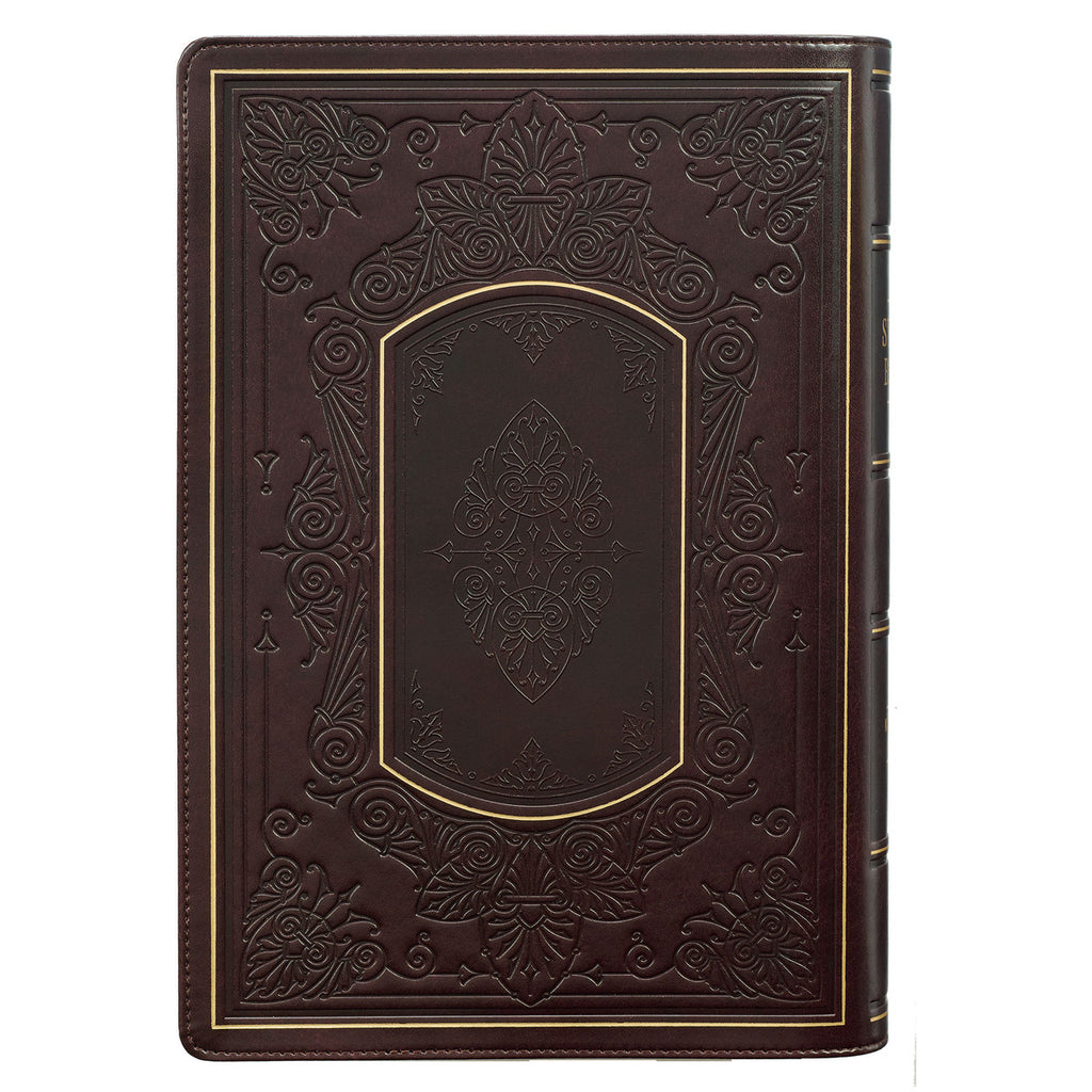 The elegant burgundy faux leather front and back covers of the Bible are adorned with gold-foiled frames, surrounding a meticulously crafted heat-debossed fluted leaf scrollwork pattern. The arching frame in the middle of the front cover embraces the title, presented in dignified gold-foiled letters.