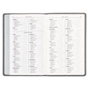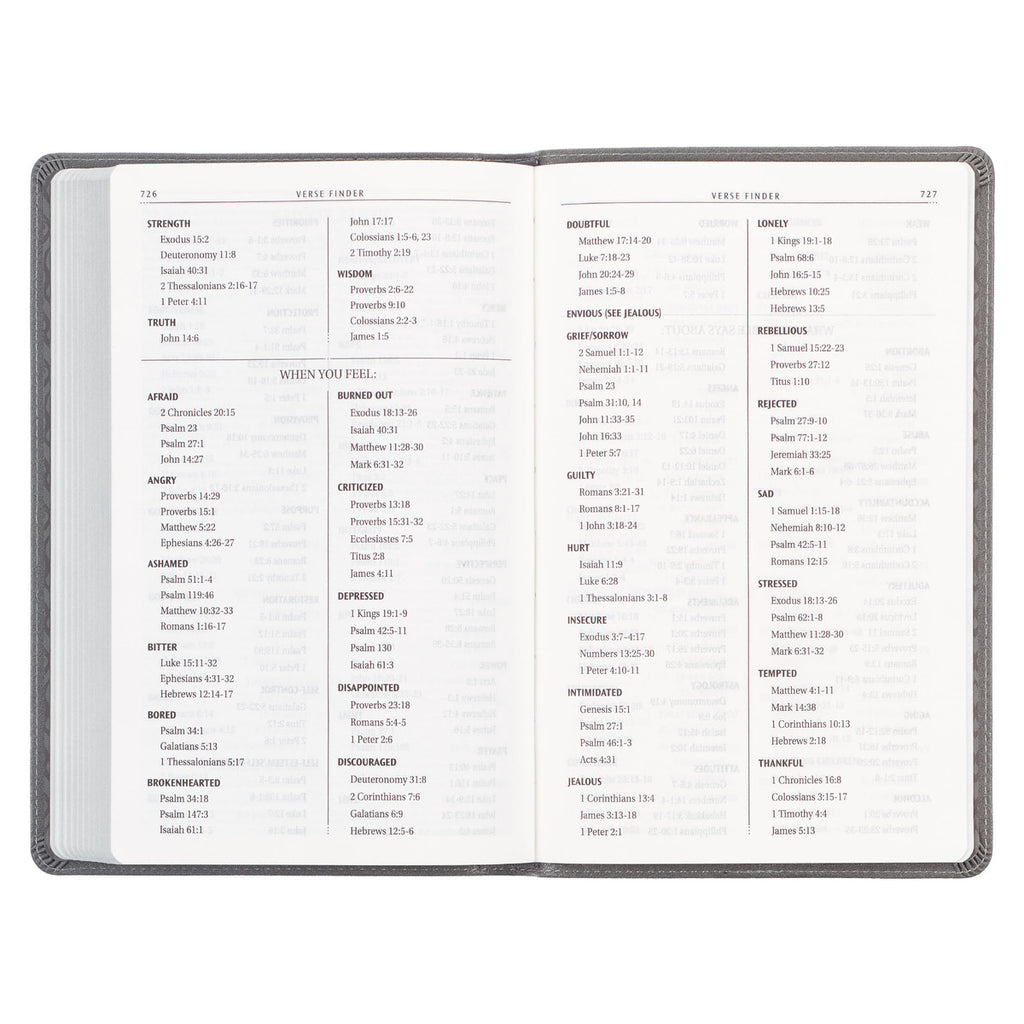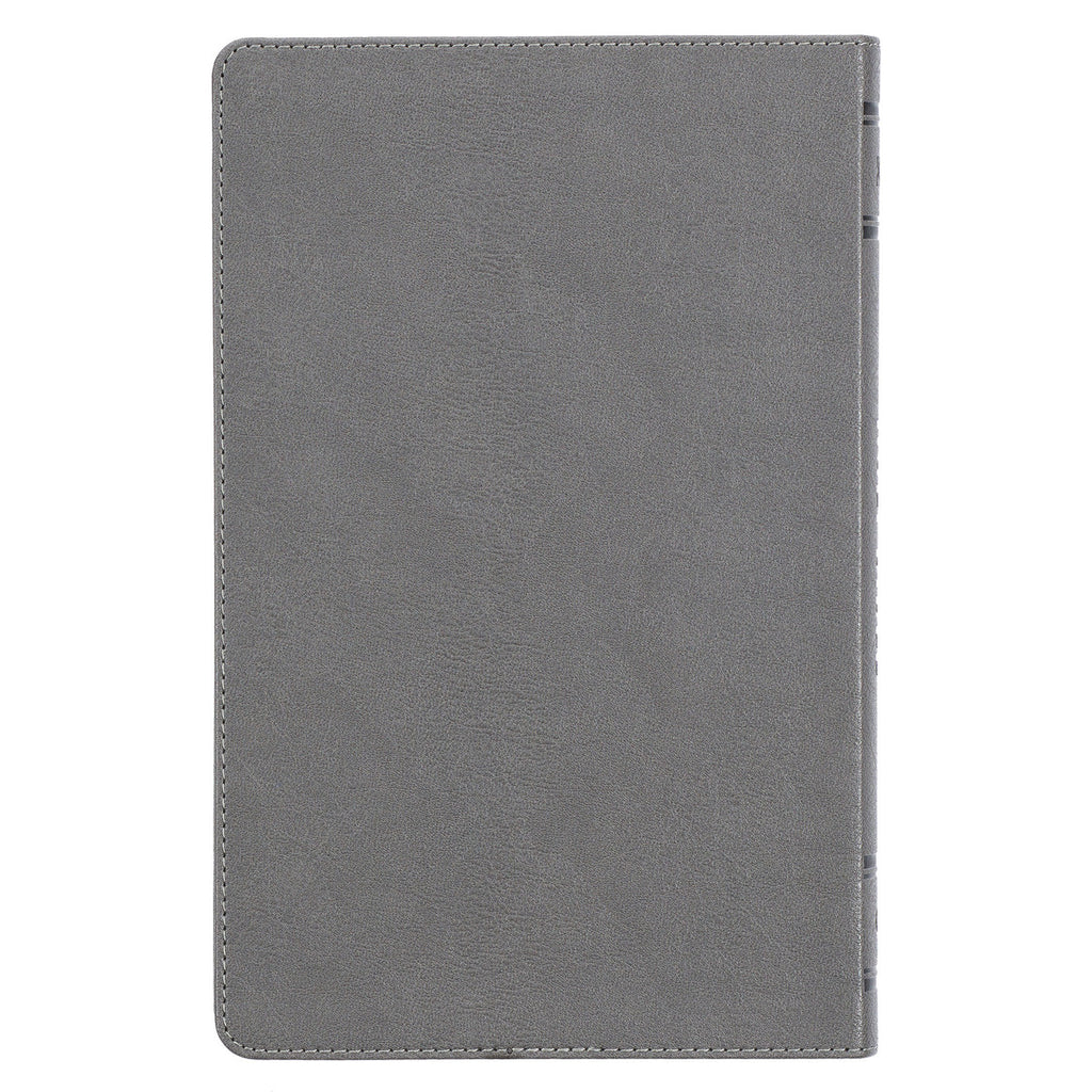 Charcoal gray topstitching supports the edges of this handsome Bible. The heat-debossed title is repeated on the spine and flanked by two sets of heat-debossed faux spine ribs. Silver-sprayed page edges add a subtle sheen to the regal design.