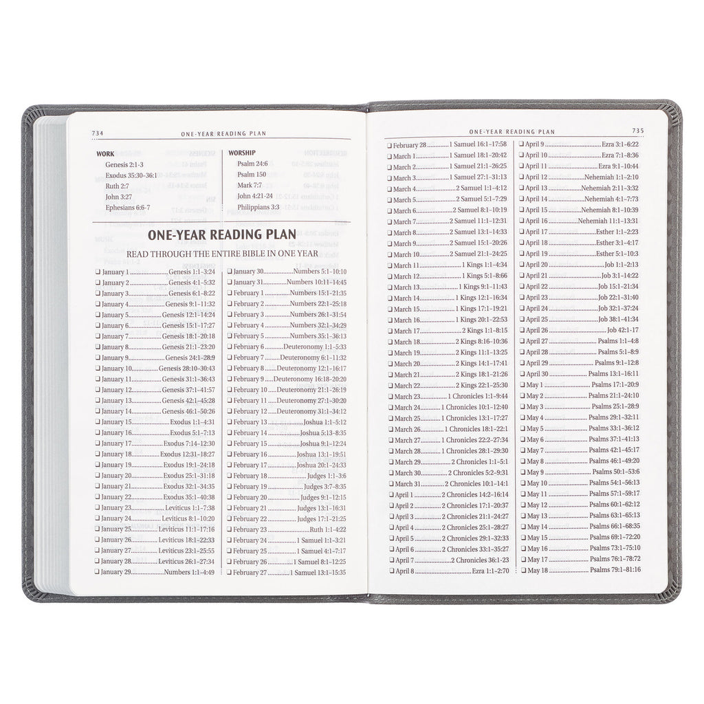The Bible features a standard 8-point print presented in a double-columned format. The lay-flat spine allows the book to open fully without causing damage. At the back, a thematic Scripture verse finder enables you to look up verses by theme. A comprehensive one-year Bible reading plan for guided reading accompanies it. Additionally, the front features a presentation page at the beginning where a name and date can be marked.