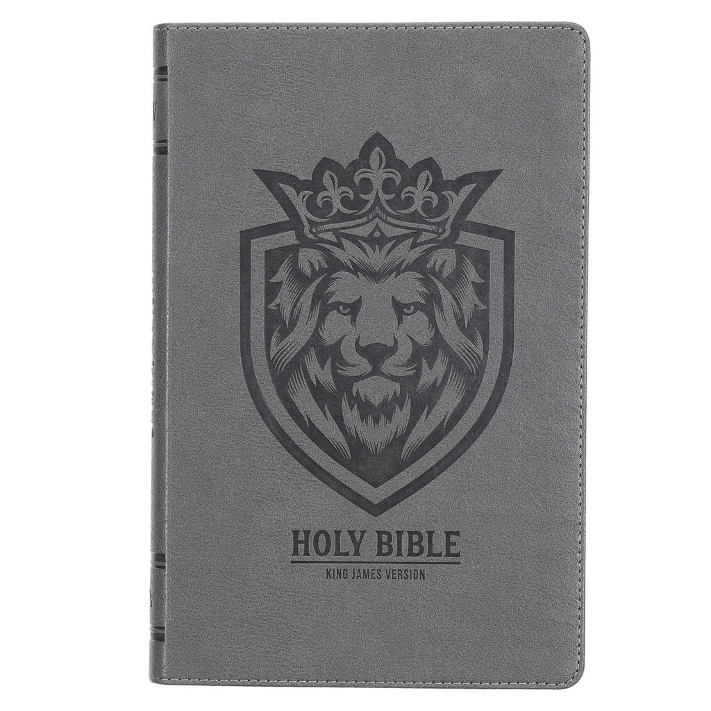 The striking Charcoal Faux Leather Gift Edition King James Version Bible features a captivating lion face design. This affordable Bible combines a modern aesthetic with the revered Classic 1769 King James text. It makes for a remarkable and memorable gift, ideal for commemorating achievements or important milestones, that will leave an abiding impression on the recipient.