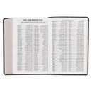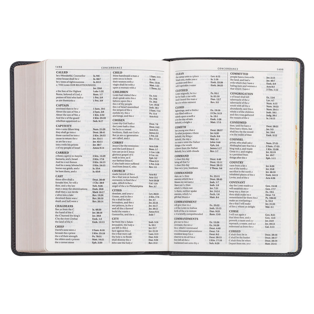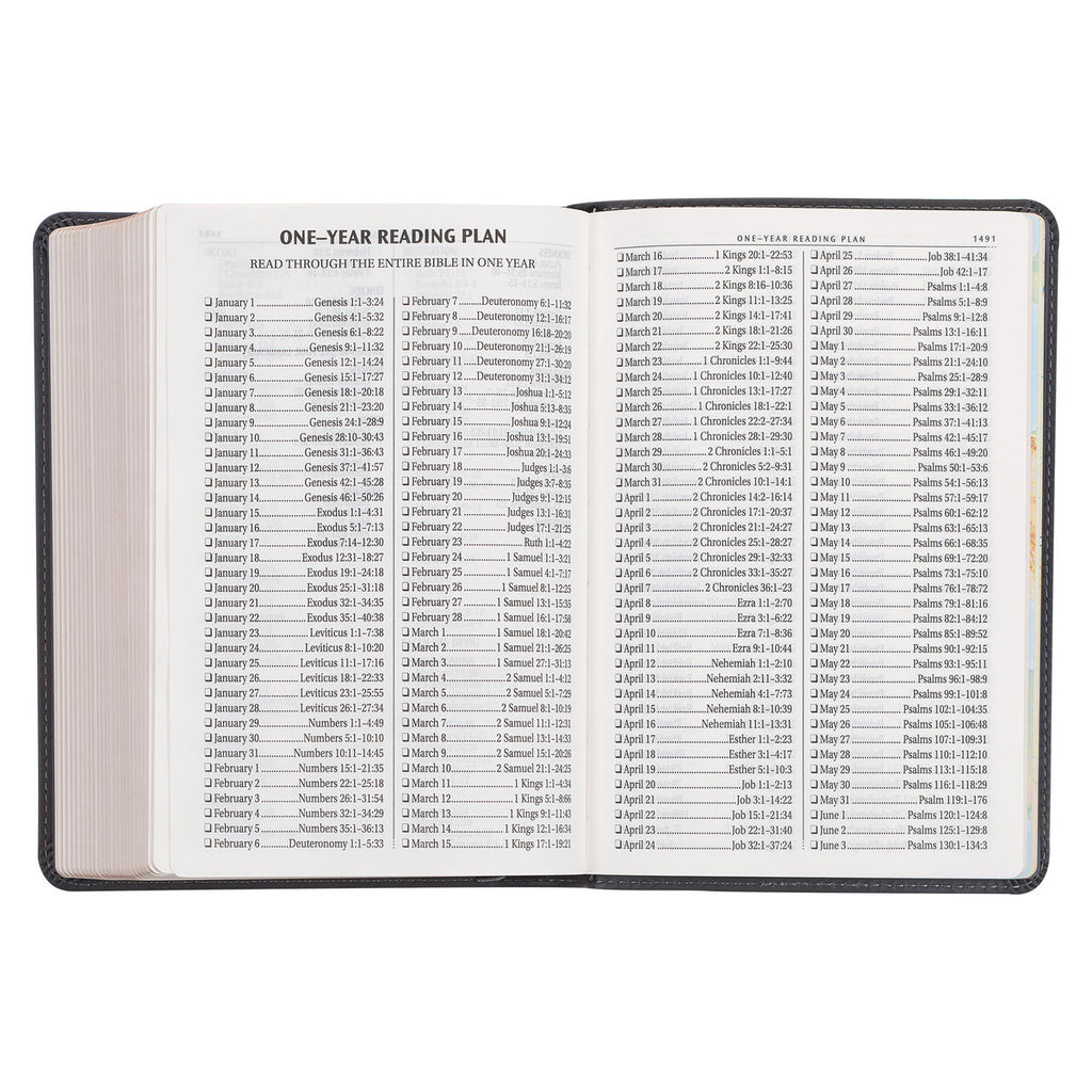 An additional heat-debossed frame with the rose-gold-foiled title decorates the Smyth-sewn spine that conveniently opens flat without damage. Numerous user-friendly features are included in the Bible to ensure enhanced readability. Double-column formatting and 10-point type ensure effortless reading and quick navigation. Valuable resources such as a thematic Scripture verse finder, concordance, one-year reading plan, and eight full-color maps assist in studying Scripture and understanding its context. Additionally, the distinctive feature of Christ's words printed in red ink adds visual emphasis and makes them stand out within the text.
