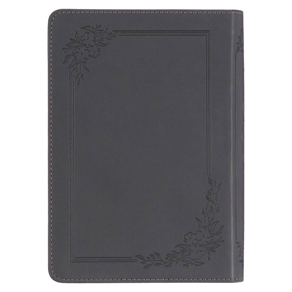The smooth cobalt gray faux leather covers of the large print Bible showcase an understated yet elegant heat-debossed frame. Delicate floral swags are tastefully positioned in opposite corners, adding a feminine touch to the overall aesthetic. To further enhance the feminine feel, a pink-foiled title is elegantly placed atop the heat-debossed version reference, right in the center of the frame.