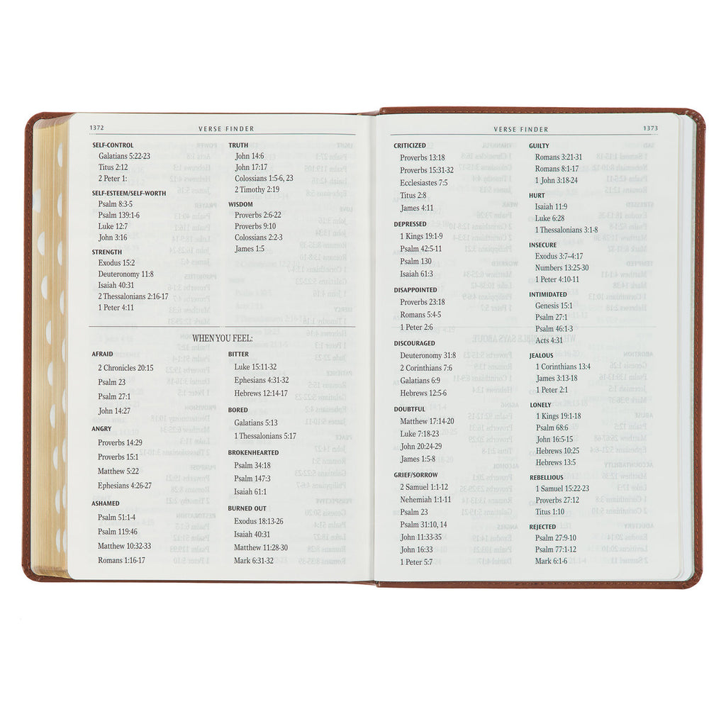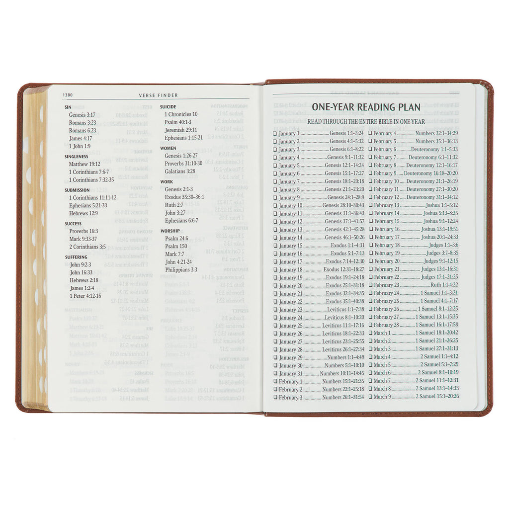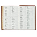 The flexcover Bible boasts a Smyth-sewn binding that enables it to open flat without compromising the spine's integrity. A brown satin ribbon is included to act as a convenient page marker, while thumb indexing tabs aid in easy navigation. The cover edges and rounded corners are reinforced with topstitching, ensuring long-lasting durability, while gilt-edged pages add a touch of elegance to the Bible's aesthetic appeal.