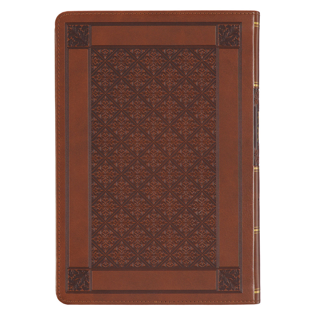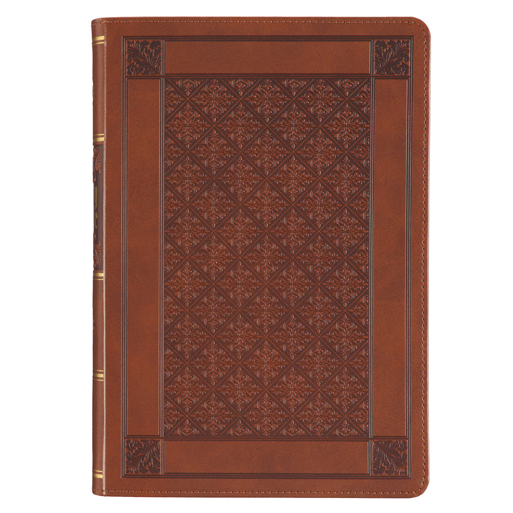 Intricate heat-debossed quatrefoil Fleur de lis floral patterns are framed within diamond shapes and skillfully intertwined in a patchwork arrangement on the honey-brown faux leather covers of the giant print Bible. The patchwork design is accentuated by a dual border adorned with extra fleur de lis floral corner motifs. The spine showcases the title in gold foil, accentuated by five gold-foiled faux spine ribs. The version reference is also presented on the spine, adorned with a heat-debossed Fleur de lis flourish.