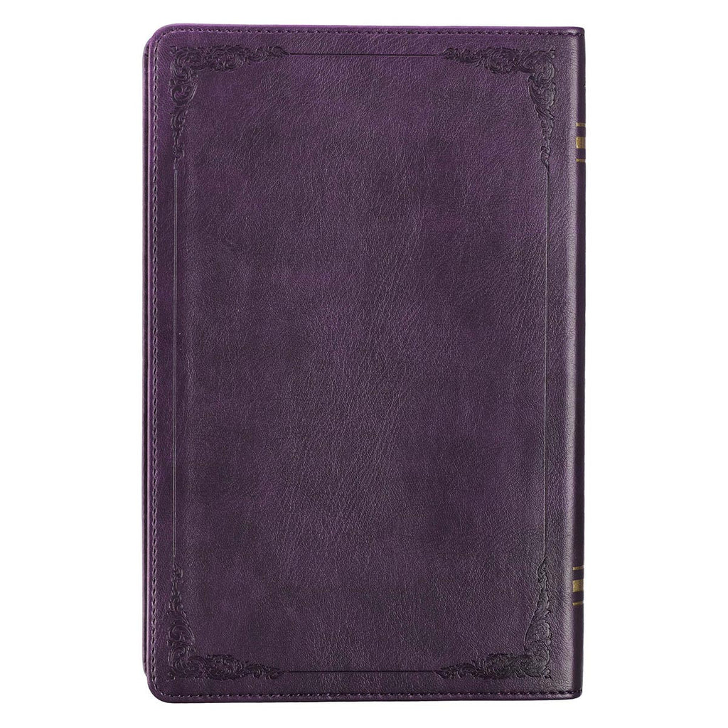 The intense purple faux leather cover is elegant, yet understated. The gold foiled title and heat debossed version imprint on the front cover of the King James Version Deluxe Gift Bible is framed by a thin heat debossed frame anchored by four corner scrolls.