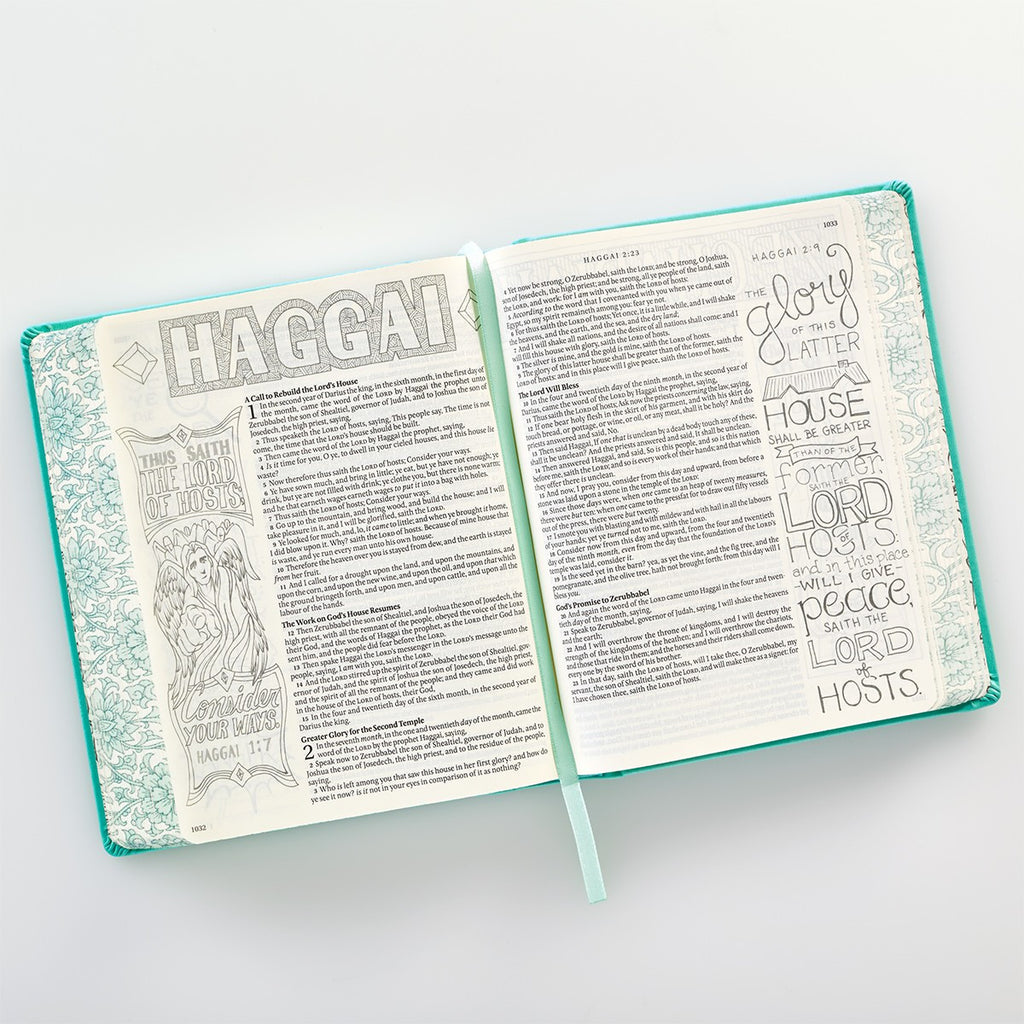 The teal hardcover Bible is set in a single-column format with two-inch-wide ruled margins for note-taking, scribing your reflections, or creative expression. Nearly 400 hand-drawn line-art illustrations are placed throughout the Bible to serve as visual tools for meditating and reflecting on Scripture.