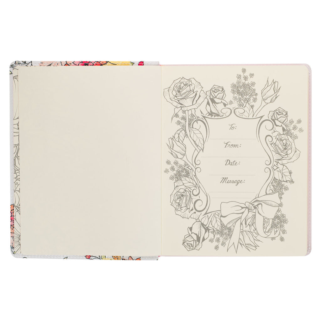 To create a harmonious composition, the floral bouquet design is repeated on the back cover. The raised black outline is expertly applied to this bouquet and also accents the spine title and version reference. The addition of salmon pink sprayed page edges and two ribbon markers, one in white and one in pink, create a cohesive aesthetic that seamlessly ties together the overall look and feel of the Bible.
