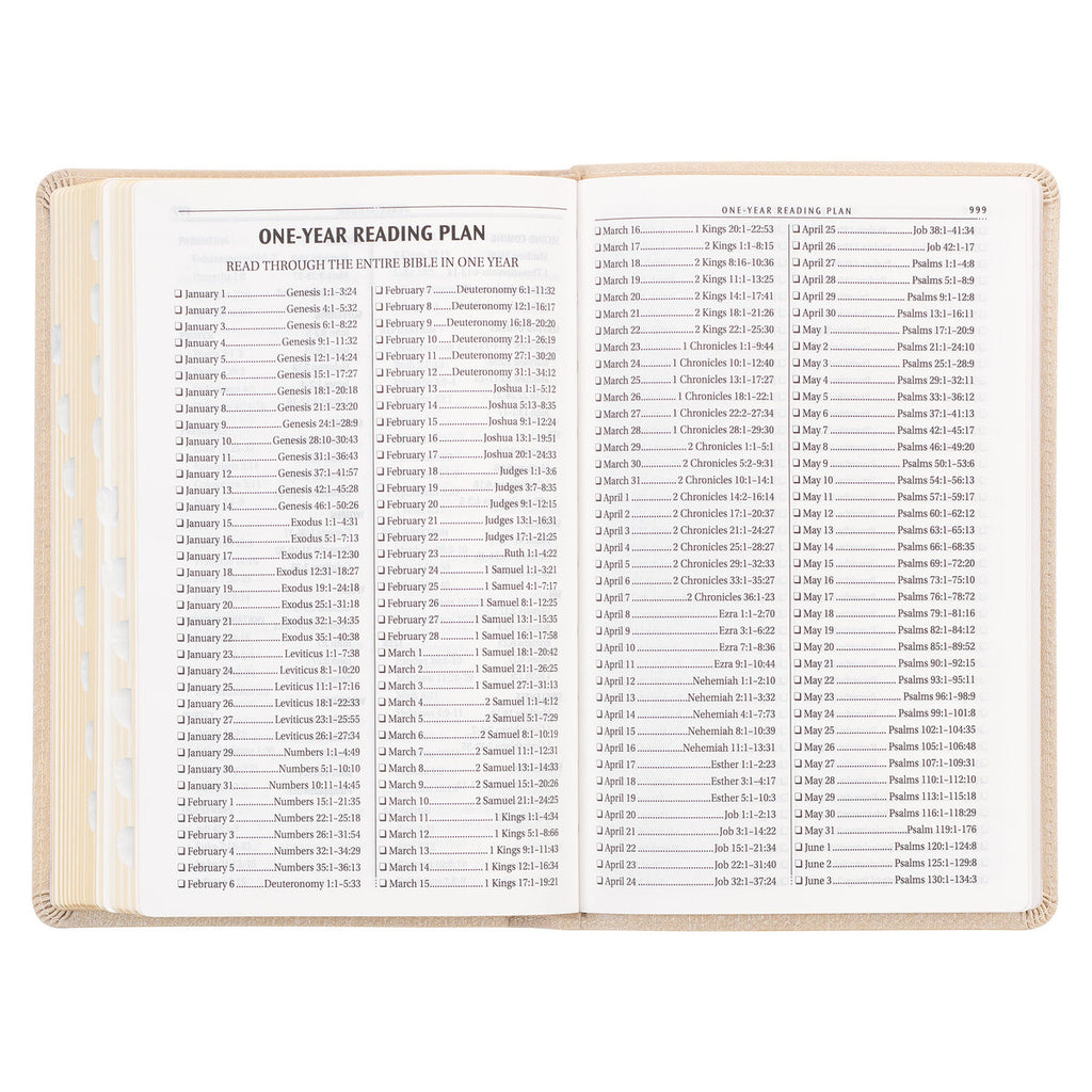 The Pearlized Ivory Faux Leather King James Version Deluxe Gift Bible with Thumb Index features a soft feminine design complemented by intricate gold-foiled details. With its classic King James Version text, this Bible is a perfect gift choice for a beloved mom or cherished daughter.
