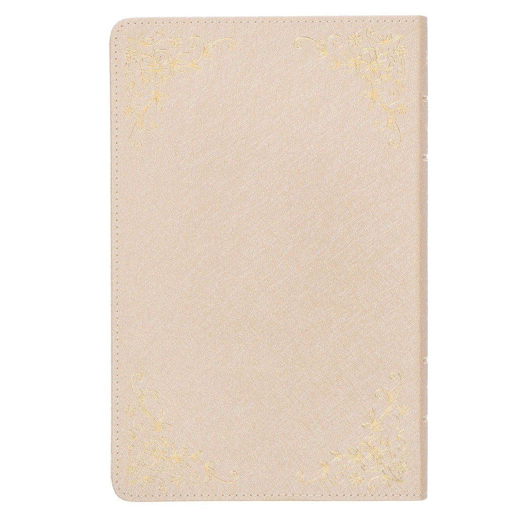 The shimmery pearlized ivory faux leather cover of the King James Version Deluxe Gift Bible showcases intricate gold-foiled floral corner designs, adding a touch of elegance and luster. Amid this exquisite design, the title is beautifully presented in gold-foiled letters.