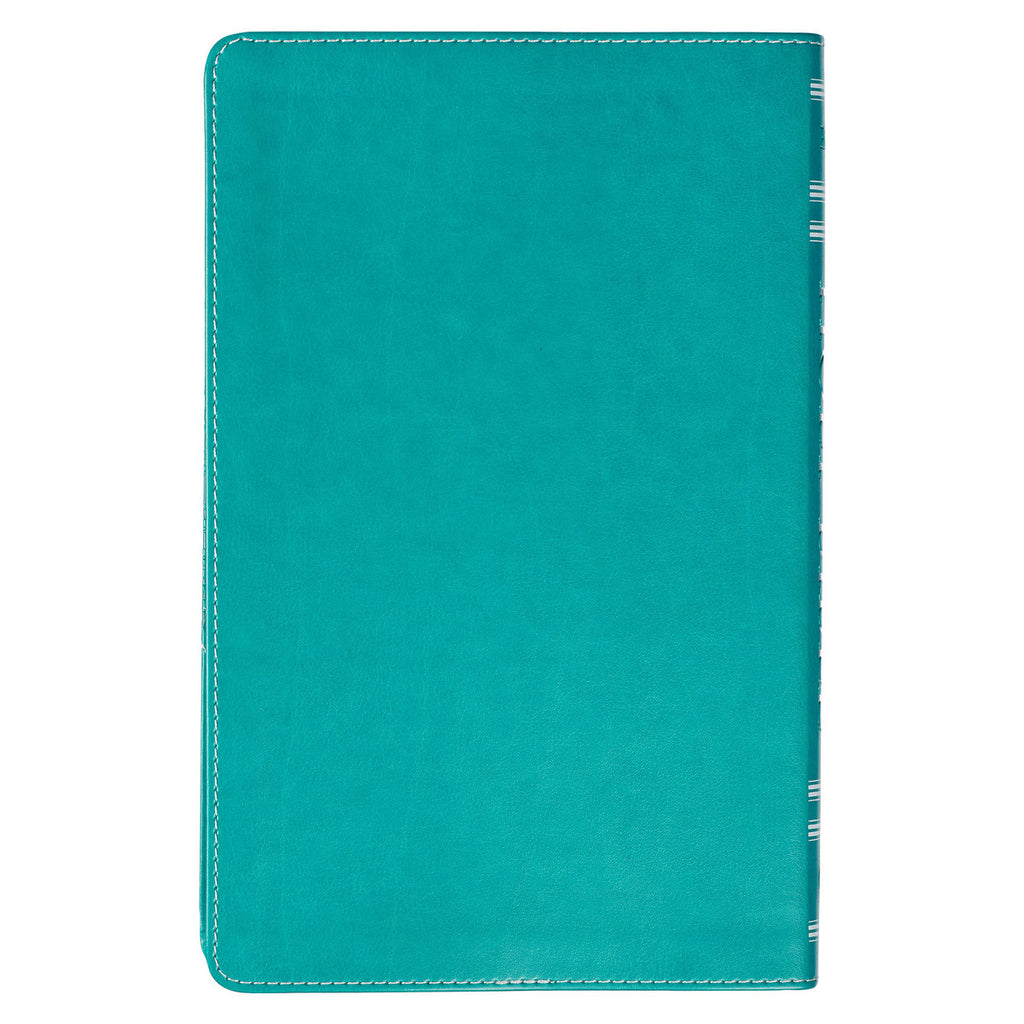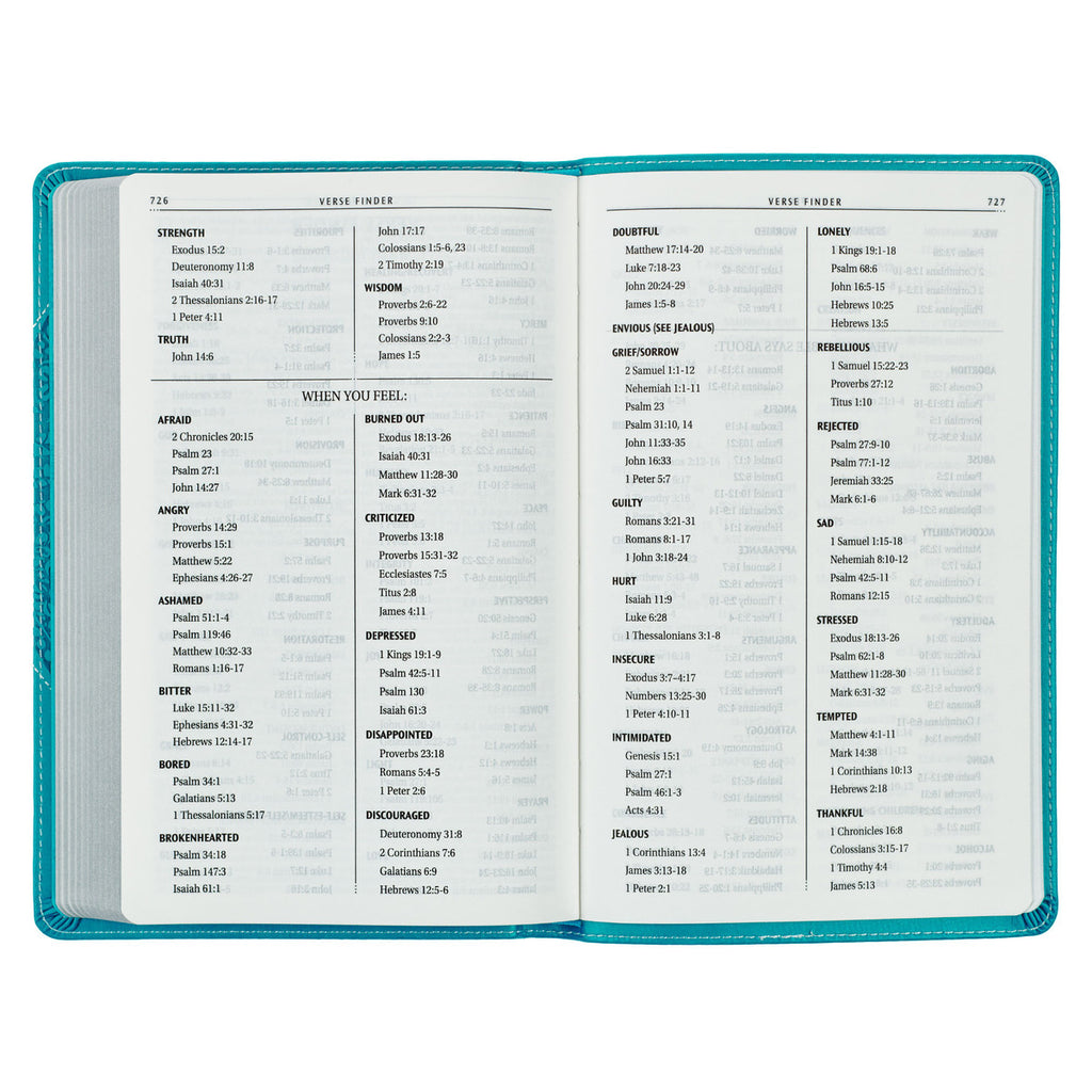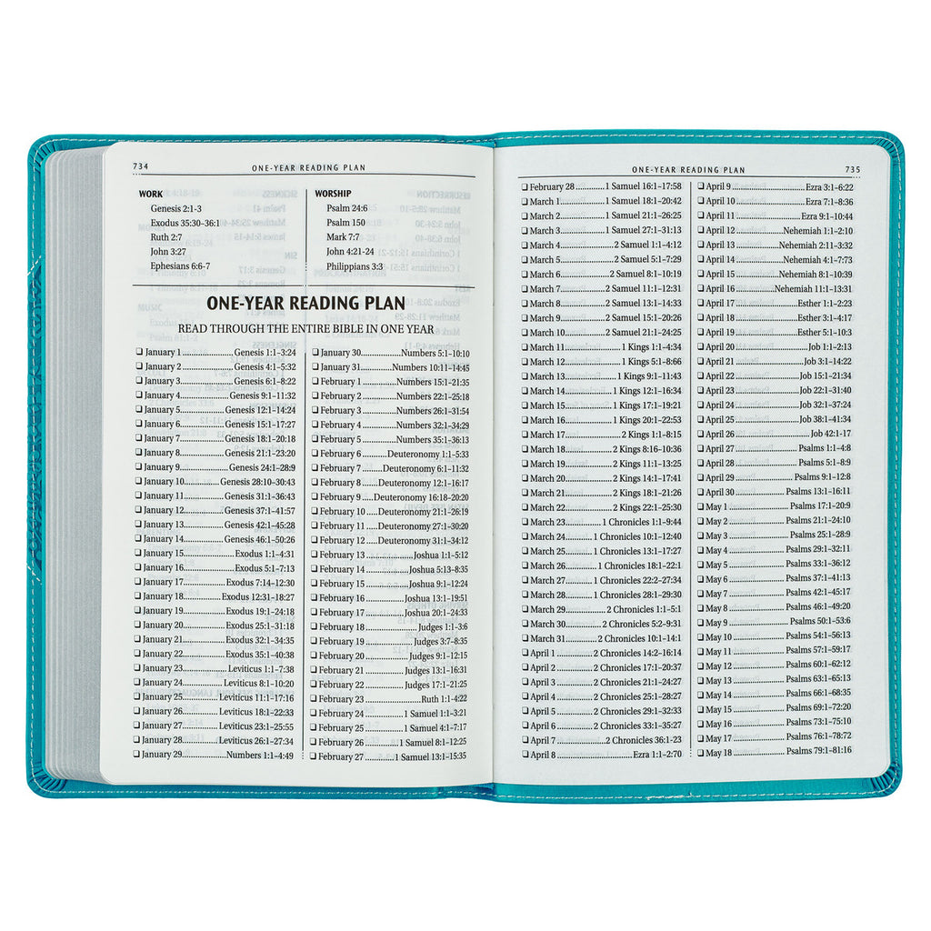 A teal presentation age prompts you to add names and a date to commemorate the gifting occasion. The lightweight Bible has a slim profile and a lay-flat spine that effortlessly opens to lay flat on a table. A small but readable 8-point type is used to present the text in a double-column format. This Bible also includes a helpful thematic Scripture verse finder and a comprehensive one-year Bible reading plan.