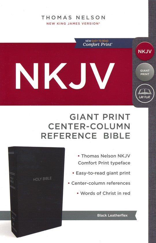 "With the NKJV Comfort Print® Giant Print Center-Column Reference Bible, you won't have to sacrifice study features for readability. Center-column references, book introductions, a concordance, and full-color maps make this the go-to Bible you'll look forward to reading. Thanks to the exclusive Thomas Nelson NKJV Comfort Print® typeface in a giant print format, your eyes will also discover a whole new level of comfort.