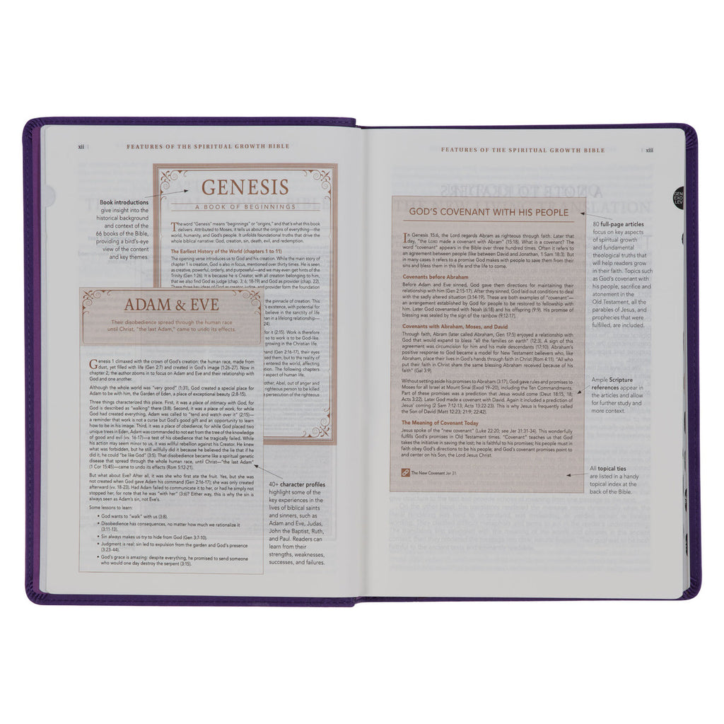 The key to spiritual growth is Bible study, and the Purple Faux Leather Spiritual Growth Bible is an excellent Bible to use for this purpose. Easy-to-understand text is paired with devotionals, more than 80 articles, 800 plus sidebar articles, character sketches, and more to grow your knowledge of God's Word.