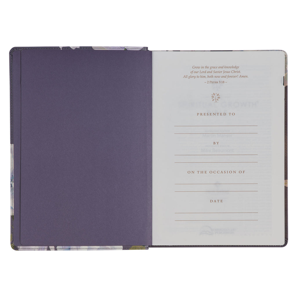 Growth is often uncomfortable, but it is always worth it. Use the Slate-colored Floral Print Faux Leather Spiritual Growth Bible to wrestle with your questions about faith. This Bible incorporates explanatory articles, character sketches, and even devotionals in easy-to-understand language to help you grow your faith.