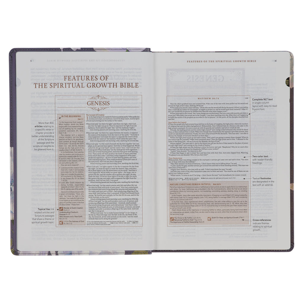 An introduction by managing editor Martin Manser and associate editor Mike Beaumont leads into the features of the Bible and an introduction to the New Living Translation. In addition to the NLT text, you will find informative sidebar articles, full-page articles on key aspects of spiritual growth and fundamental theological truths, book introductions, character profiles of men and women of the Bible, topical ties to connect articles with relevant Scripture, and cross-references. There are also a topical index at the back of the Bible and an index of articles and authors for easy reference. The Bible is packaged in a lidded box.