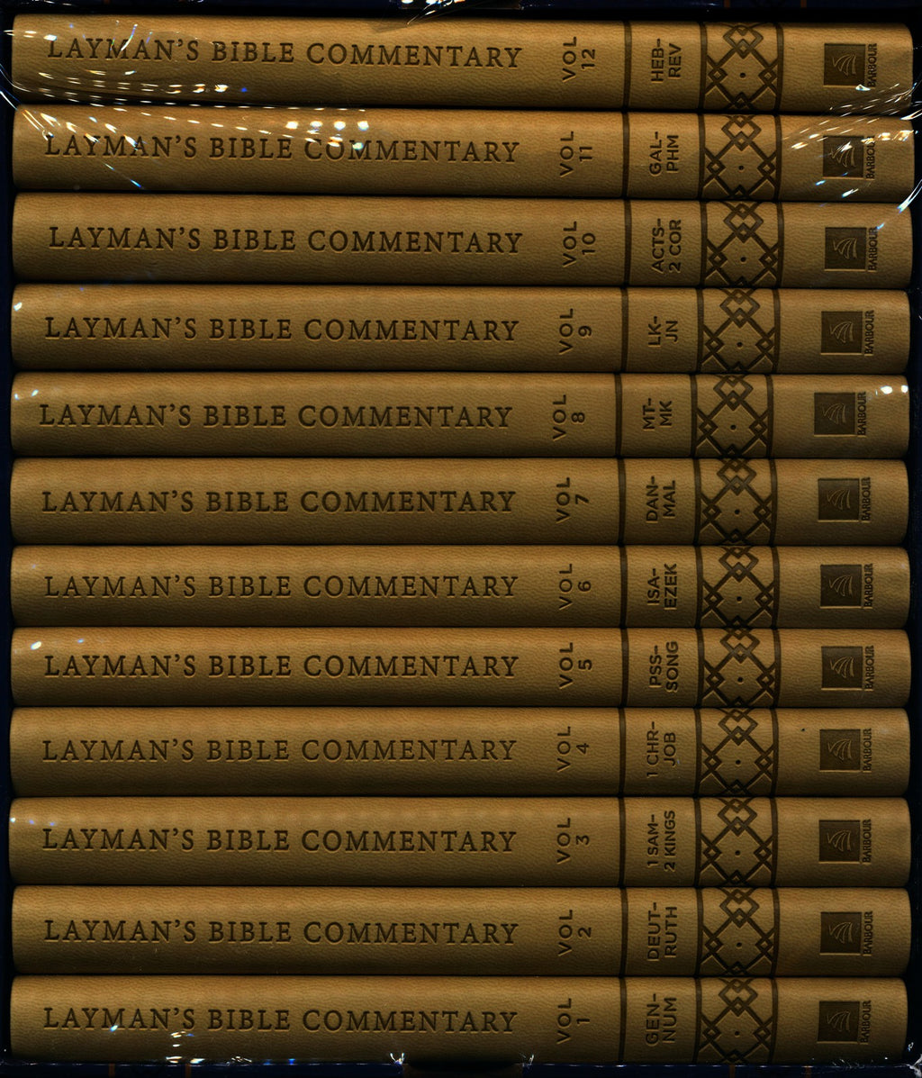 "This 12-volume set of the Layman's Bible Commentary is a wealth of accessible reference of the entire Bible that aids personal Bible study or Sunday school preparation. Designed for the everyday Christian, not the scholar, each volume has an imitation leather cover and provides section-by-section commentary on the flow and theme of each book, as well as historical and literary context for each. Major interpretations are presented for controversial passages and topics. Puzzling passages and Bible practices are explained, and charts and diagrams further aid your understanding. ""Take It Home"" segments provide a practical application for each passage."