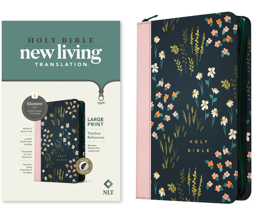 NLT Large Print Thinline Reference Zipper Bible Filament Enabled Edition-Meadow Navy Pink LeatherLike Indexed