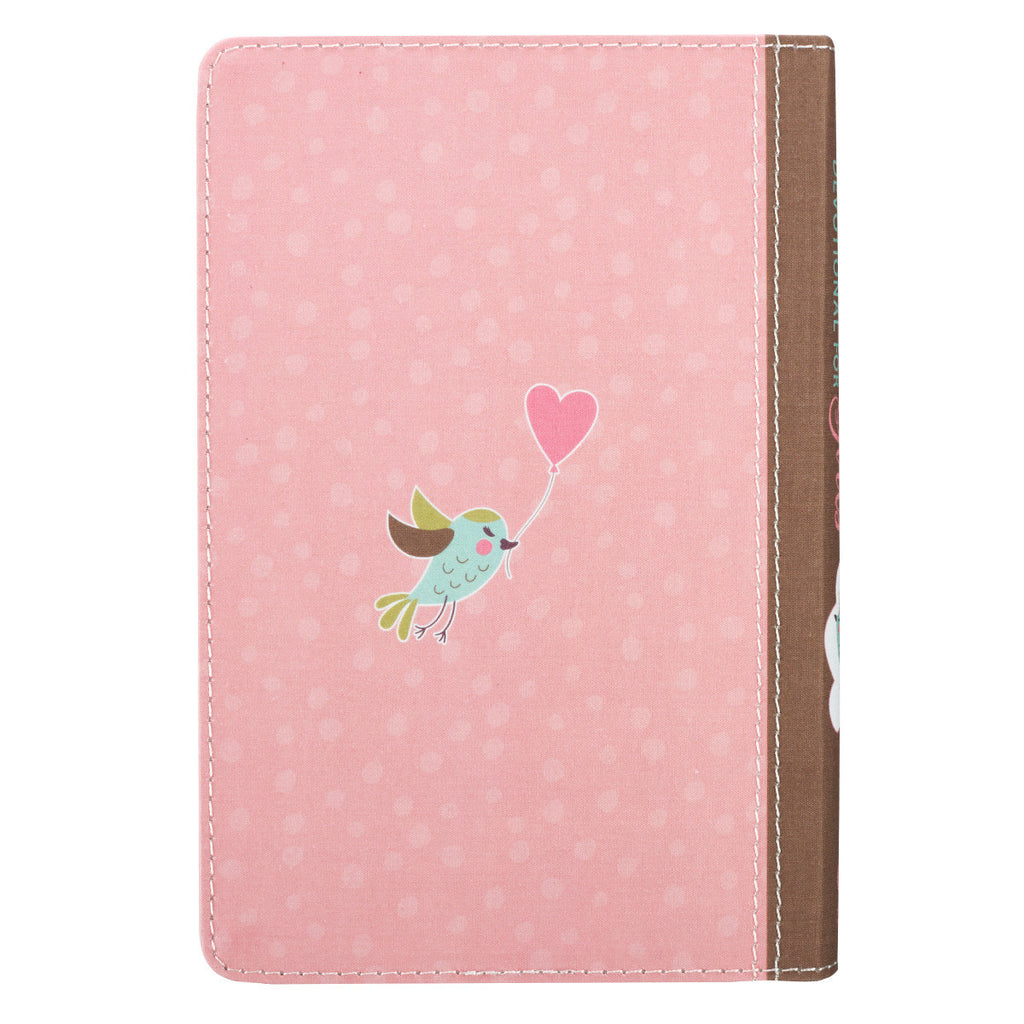 The adorably printed faux leather flexcover has an enchanting set of birds surrounded by pink hearts and clouds. A brown faux leather spine adds a striking contrast while topstitching around the edges the book add durability. The decorative printed edges, ribbon page marker, and presentation page give this book an exceptional finish.