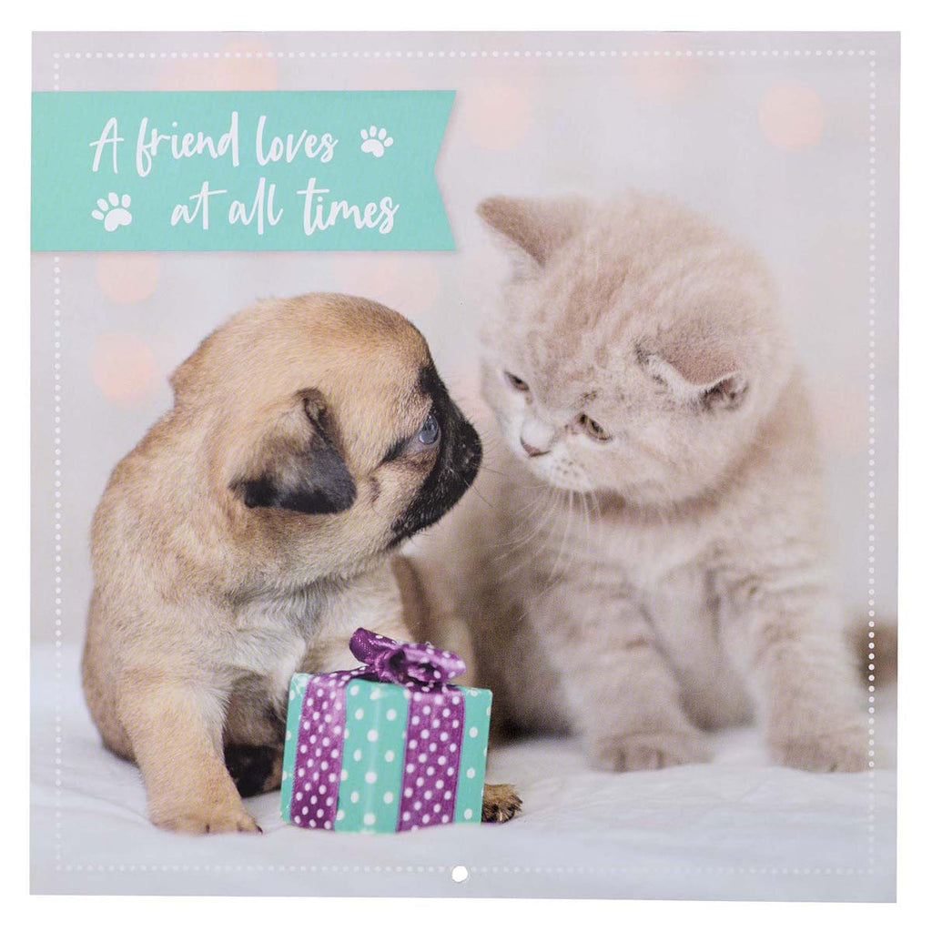 The large calendar has a glossy front cover featuring an adorable picture of a puppy and a kitten and a small gift. The sentiment, taken from the book of Psalms, is framed in teal and printed in white.